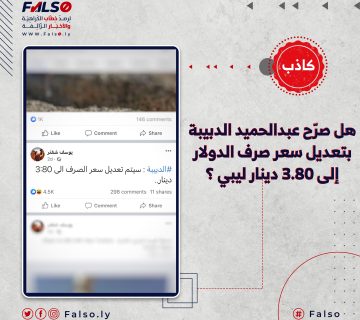 هل صرّح عبدالحميد الدبيبة بتعديل سعر صرف الدولار إلى 3.80 دينار ليبي ؟M.alnajem2 يناير، 2023تداول خلال الأيام الماضية عدد من الصفحات ومستخدمي موقع التواصل الاجتماعي فيسبوك، من بينها صفحة تحمل اسم يوسف شفتر أنشأت ... المزيد