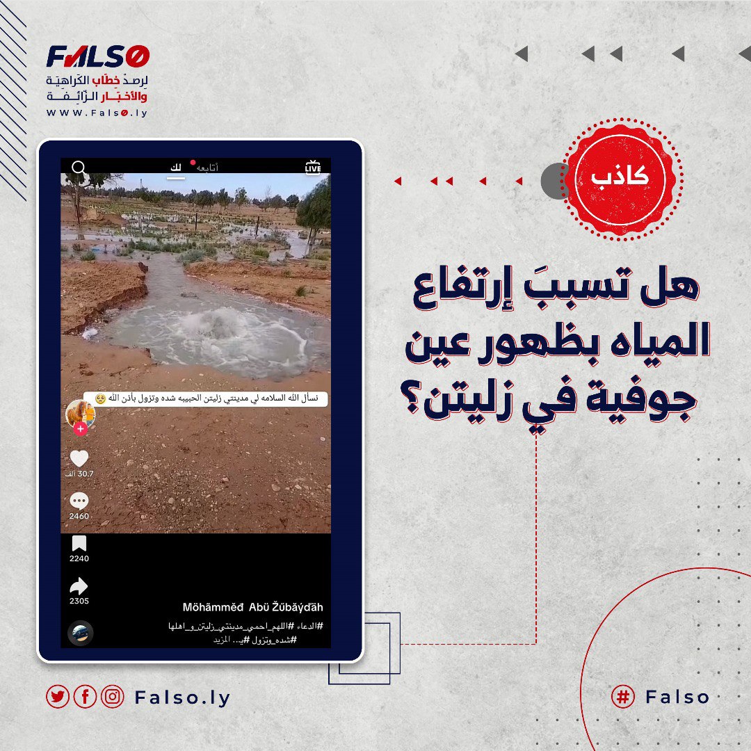 نشر حساب يُدعى محمد على موقع تيك توك فيديو يزعم أنه لظهور عيون للمياه الجوفية بمدينة زليتن، وقد حصد الادعاء ما يزيد عن مليون مُشاهدة وآلاف التعليقات والمُشاركات والإعجاب، معلقاً ” إنها شدة وستزول بإذن الله” وفقاً لتعبيره.