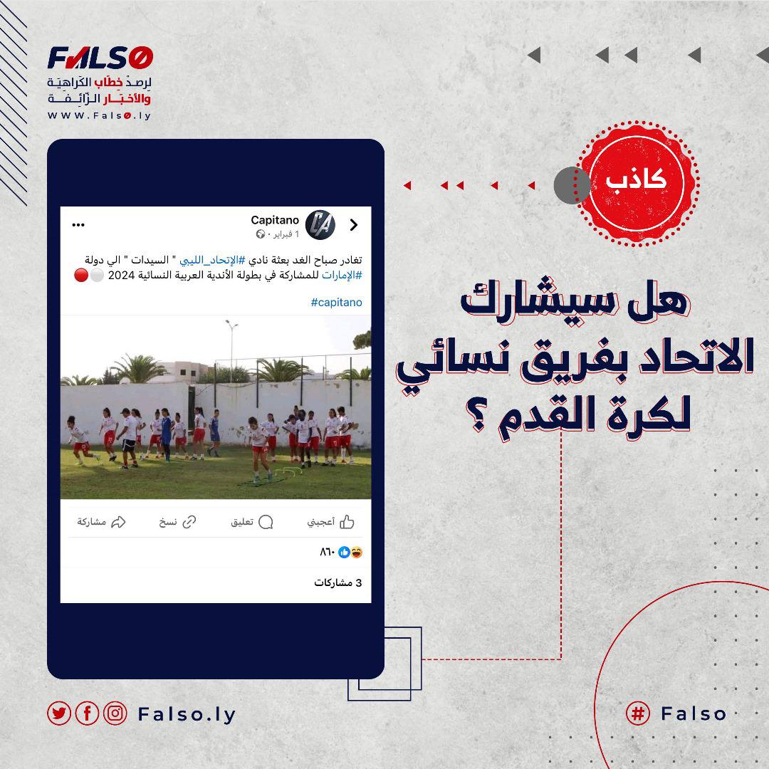 نشرت صفحة تُدعى Capitano صورة ادعاء مفاده تدريبات فريق نسائي لكرة القدم تابع لنادي الإتحاد الليبي، للمُشاركة في بطولة الاندية العربية النسائية بدولة الإمارات، وأن البعثة غادرت ليبيا وحظي الادعاء بمئات التفاعلات والتعليقات.