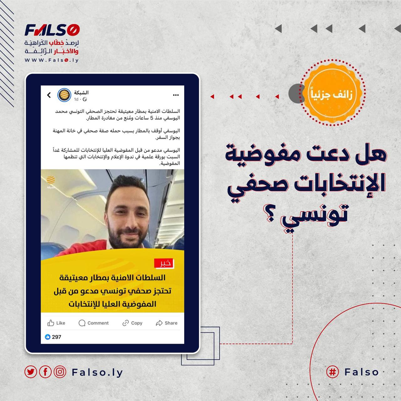 بعد البحث عن مصدر الخبر تحصل فريق فالصو على منشور نشره الصحفي التونسي محمد اليوسفي عبر صفحته على فيسبوك يوضح ما حدث معه خلال زيارته لمدينة طرابلس، كان بناءاً على دعوة قدمت إليه من قبل المركز الليبي لحرية الصحافة للمٌشاركة في أعمال الندوة ، وليس من قبل المفوضية الوطنية العٌليا للانتخابات ، التي تم إجراء الندوة في مركزها الإعلامي .