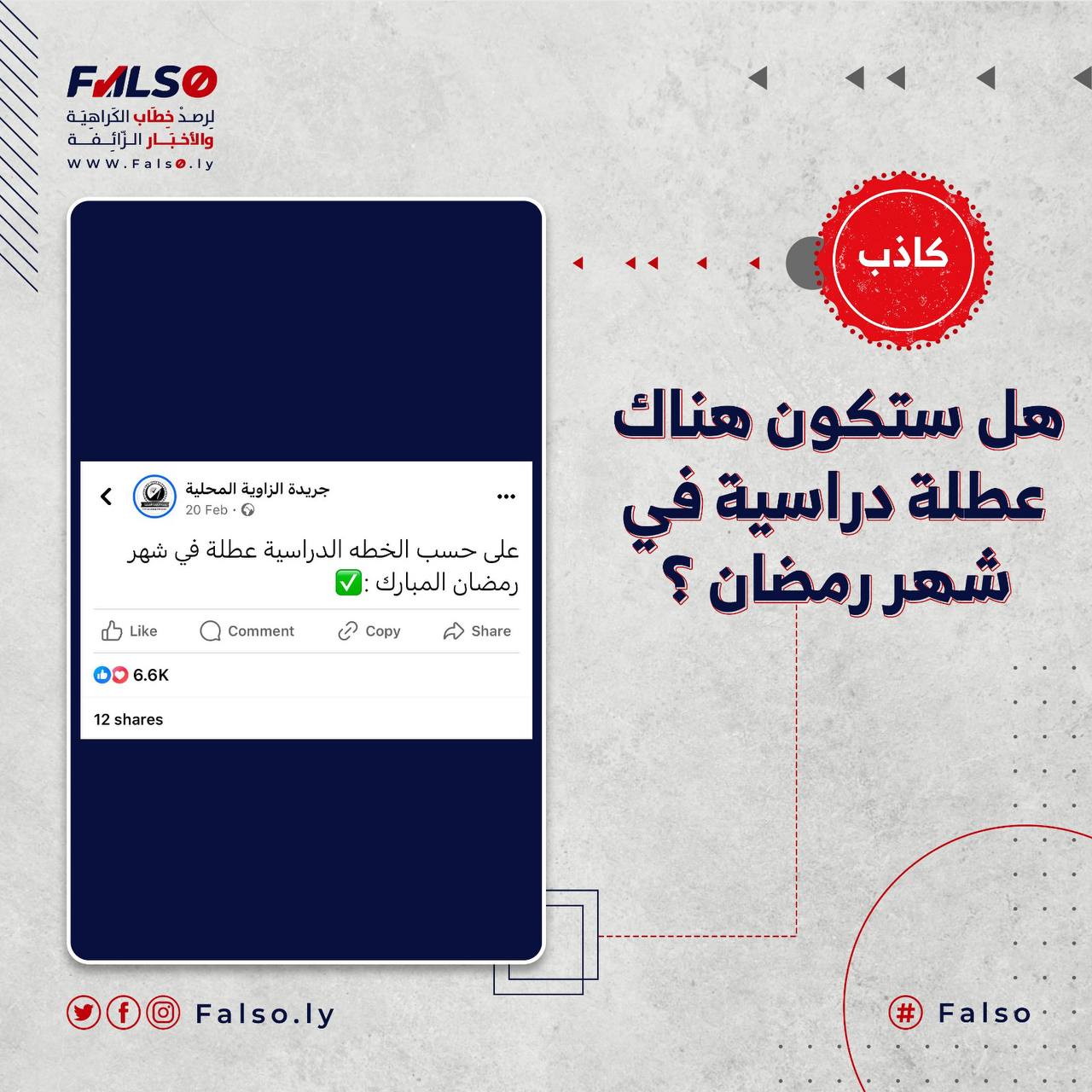 نشرت صفحة بموقع فيسبوك تُدعى “جريدة الزاوية المحلية” إدعاءاً كاذباً مفاده إن وفقاً للخطة الدراسية فإن شهر رمضان سيكون عطلة، وقد حظي الإدعاء بأكثر من 6 ألاف إعجاب و2 ألفي تعليق وعشرات المُشاركات، وذلك بتاريخ 20 فبراير الماضي.
