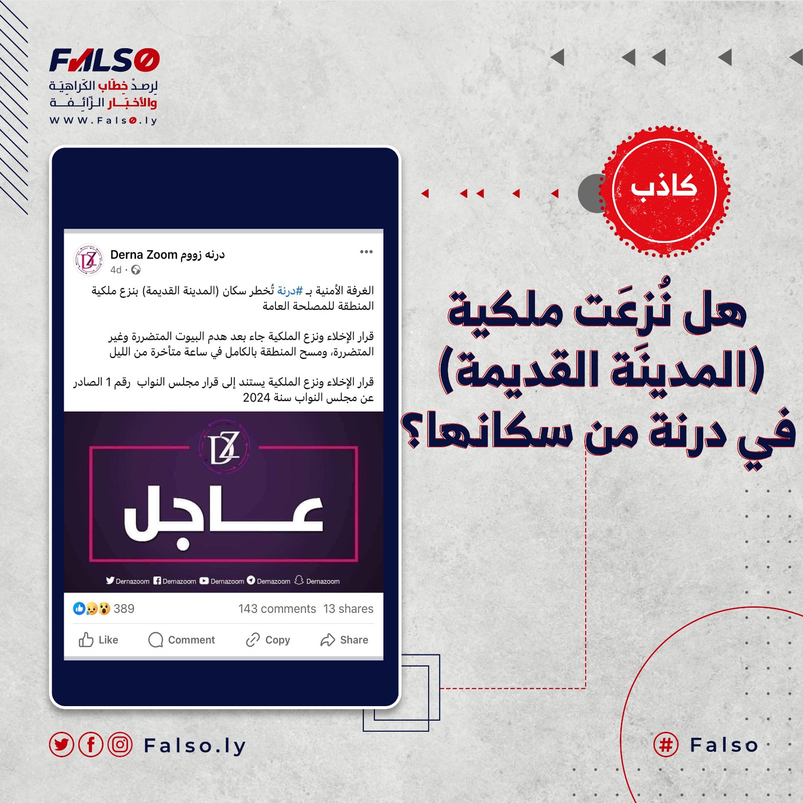 نشرت صفحة بموقع فيسبوك تُدعى “درنة زووم” إدعاءاً كاذباً حول إخطار الغرفة الأمنية في درنة لسكان المدينة القديمة بنزع ملكية المنطقة للمصلحة العامة، وإدعت الصفحة المذكورة أن الغرفة الأمنية في درنة أخطرت السُّكان بنزع الملكية وإخلاء البيوت المتضررة وغير المُتضررة ومسح المنطقة بالكامل إستناداً لقانون رقم 1 لسنة 2024 الصادر عن مجلس النواب وفقاً لإدعائهم .