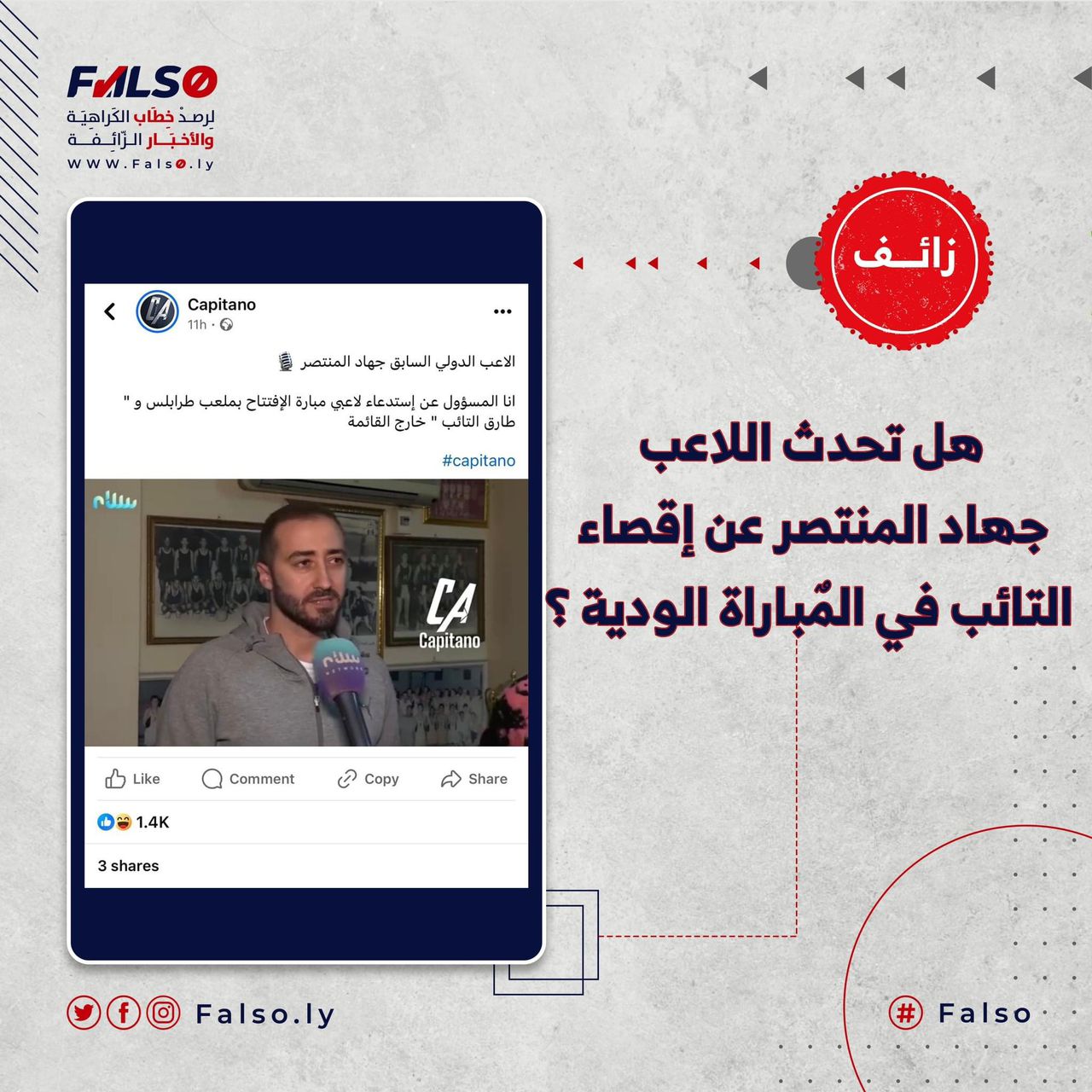 تحقق فريق فالصو من الادعاء، وتبين أن اللاعب الدولي السابق جهاد المنتصر لم يقم باستدعاء أي لاعب أجنبي أو ليبي وليس لديه أي علاقة بعملية استدعاء اللاعبين، وفقاً منشور نشره عبر حسابه على موقع فيسبوك، وإن لديه علاقة جيدة مع اللاعب طارق التائب وتحدث عن تغيبه عن اللعب بسبب ظرف صحي، إلا إنه سيكون حاضرًا بالملعب.