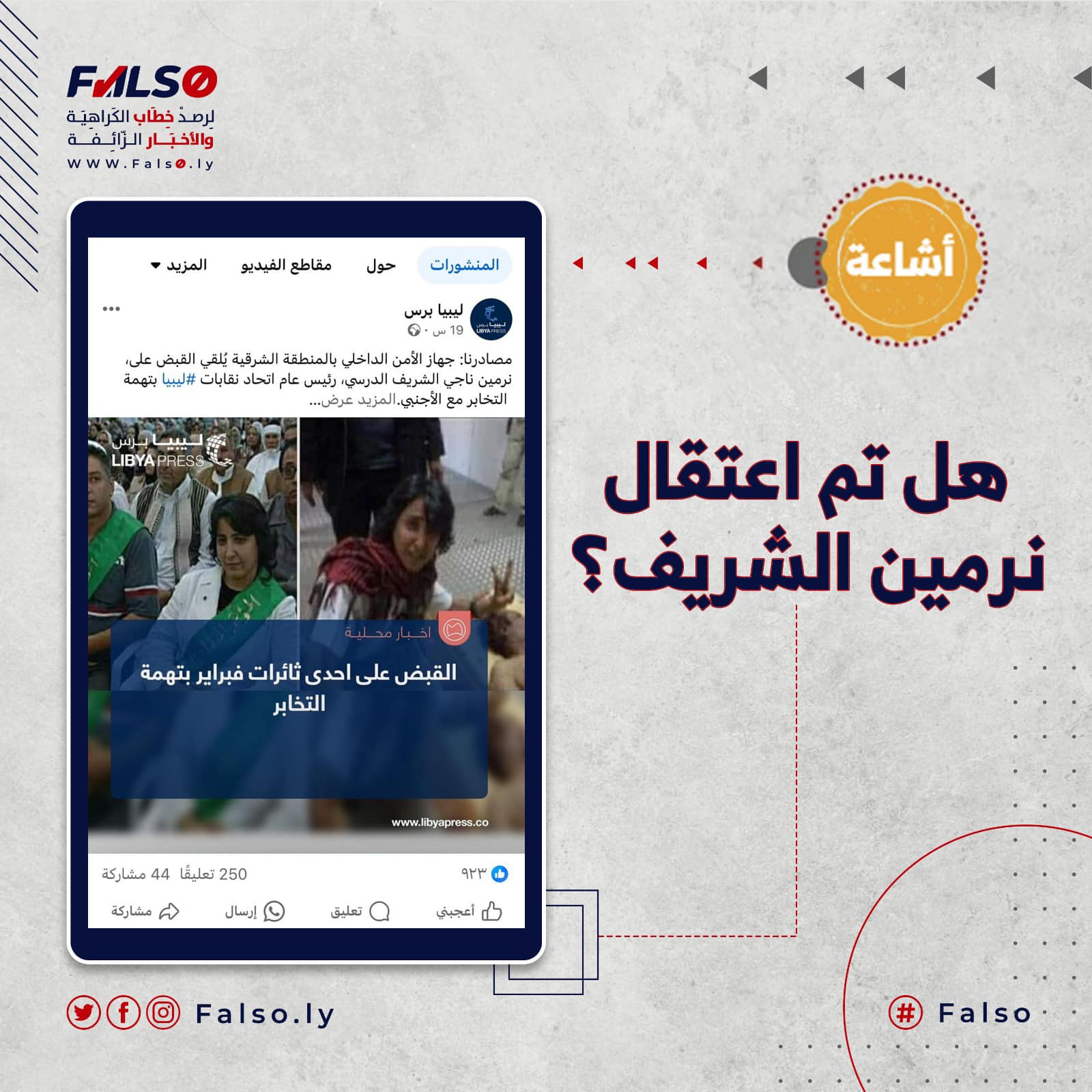 قام فريق فالصو بالتحقق من الادعاء بالبحث في الصفحة الخاصة باتحاد النقابات والصفحة الخاصة لرئيس النقابة نرمين الشريف، وتبين أنها نشرت في صفحتها الشخصية على الفيس بوك تسجيل مصور تنفي خبر ادعاء اعتقالها من قبل الأمن الداخلي في مدينة بنغازي، وأكدت وجودها في بنغازي وسط عائلتها، ولم تتعرض حتى للتحقيق.
