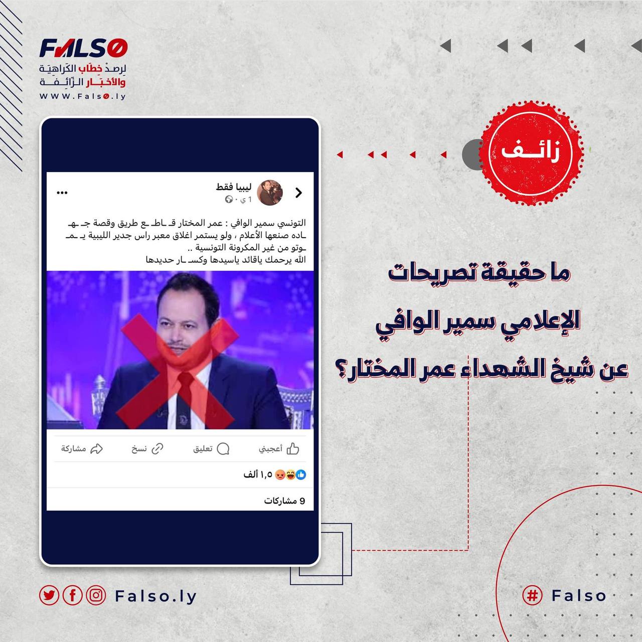 نشرت صفحة بموقع فيسبوك تُدعى ليبيا فقط، ادعاء زائفاً حول تصريحات للإعلامي التونسي سمير الوافي، يتهجم فيها على الزعيم الليبي عمر المختار، ويصفه بقاطع الطريق، ويقول إن الليبيين يموتون بدون المكرونة التونسية في ظل إغلاق منفذ رأس جدير الحدودي بين ليبيا وتونس.