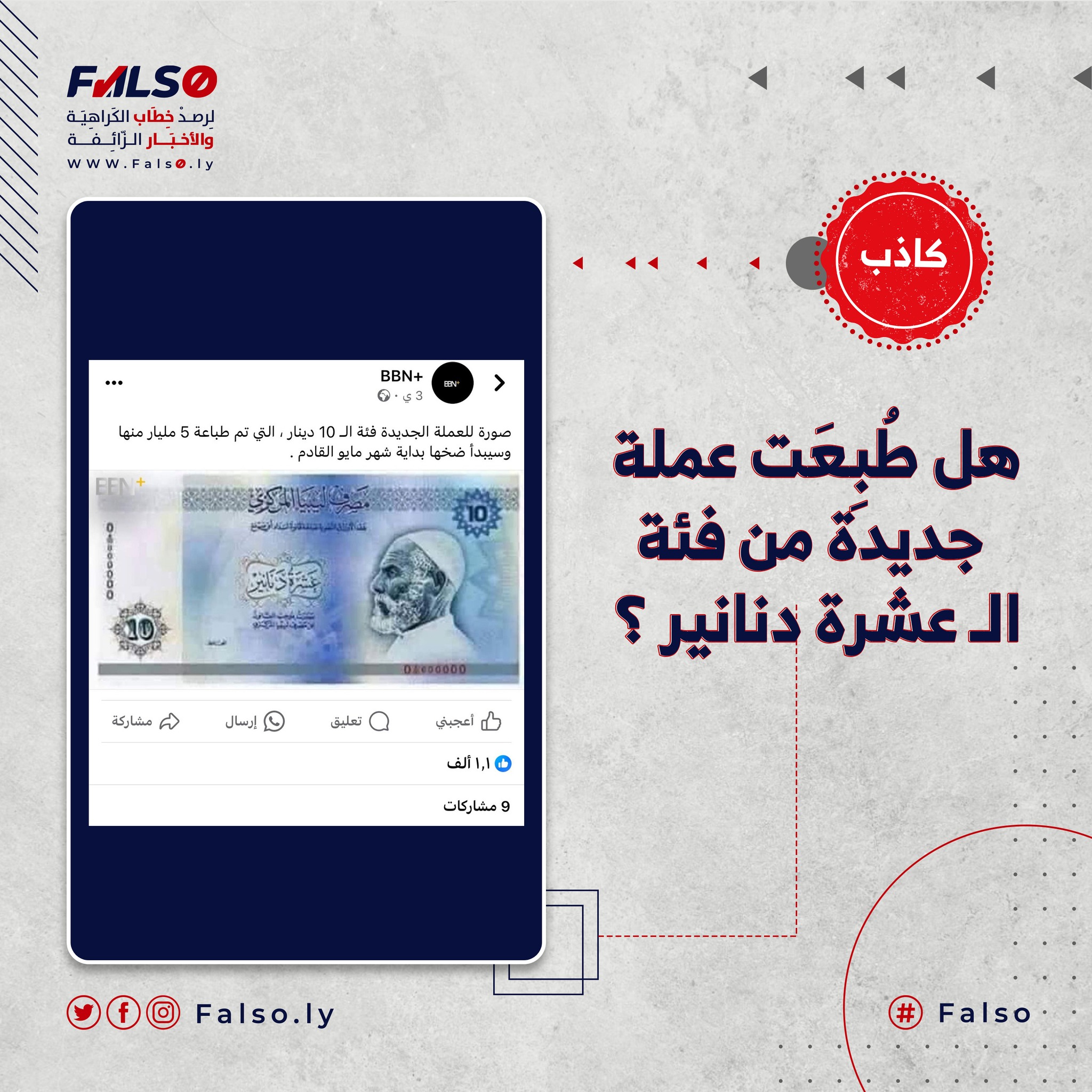 قام فريق فالصو بالبحث والتحقق من صحة الادعاء عبر الموقع الرسمي لمصرف ليبيا المركزي، وتبين عدم وجود تصريح رسمي من قبل المركزي يفيد طباعة شكل جديد للعملة فئة عشرة دنانير.