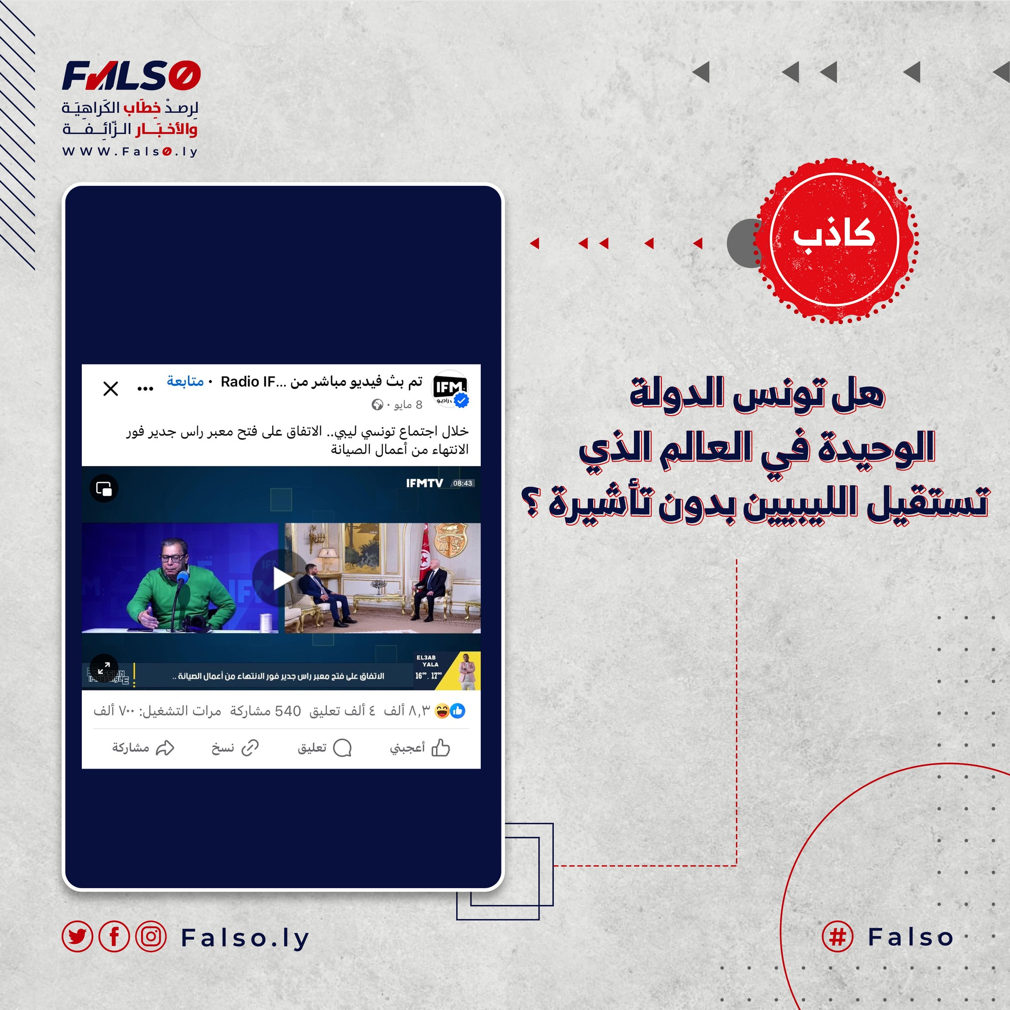 وتحقق فريق فالصو من الادعاء الثاني عن طريق العودة لتصنيف ليبيا في مؤشر ترتيب جوازات السفر ومعلومات التأشيرات “Visa index”، وتبين أن تونس ليست الدولة الوحيدة التي يدخلها الليبيين دون تأشيرة بحسب المؤشر فإن 13 دولة حول العالم تسمح بدخول الليبيين دون تأشيرة بما فيهم دولة تونس، وأن 25 دولة حول العالم تطلب تأشيرة من الليبيين عند الوصول، ودولتين تطلب تصريح سفر إلكتروني.