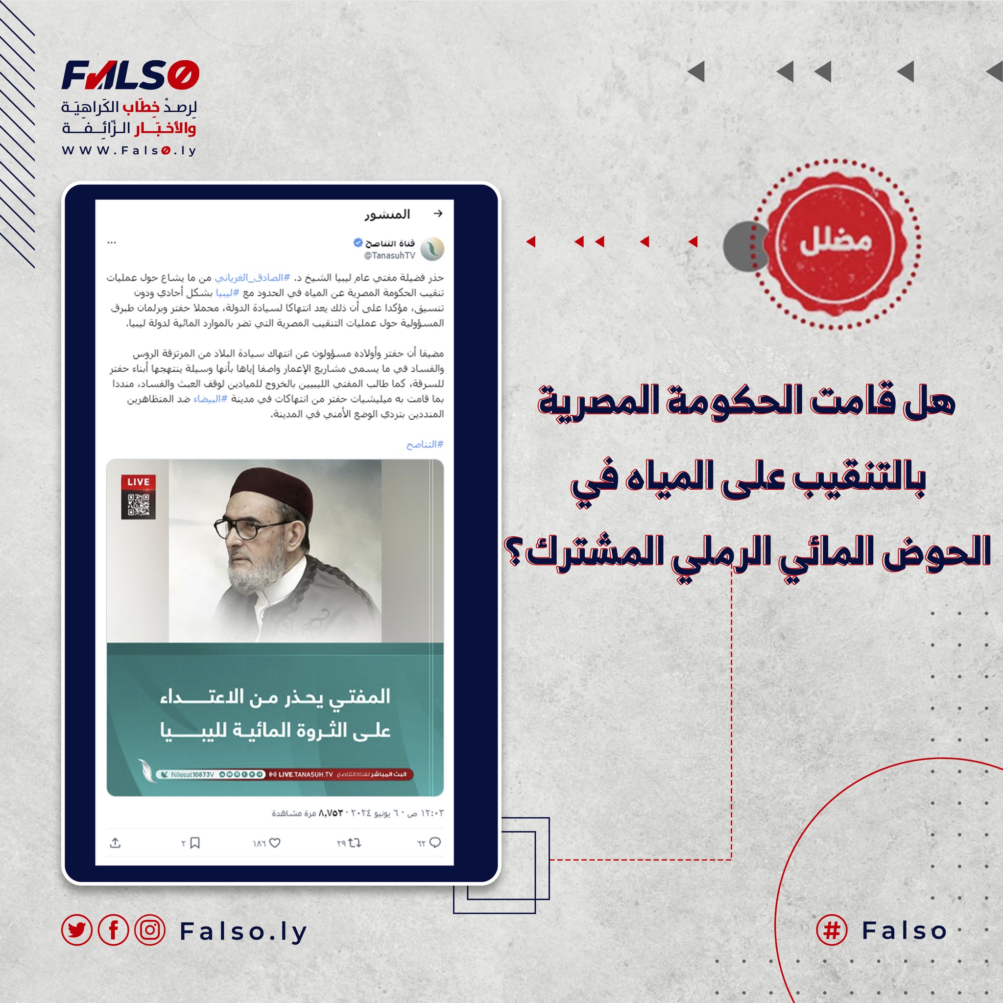 نقلت قناة التناصح على حسابها بموقع إكس تغريدة للمٌفتي الديار الليبية الشيخ الصادق الغرياني، قوله حول ” ما يشاع عمليات تنقيب الحكومة المصرية عن المياه في الحدود مع ليبيا بشكل أحادي ودون تنسيق، مؤكدا على أن ذلك يعد انتهاكا لسيادة الدولة الليبية، مُحملا “حفتر وبرلمان طبرق “المسؤولية حول عمليات التنقيب المصرية التي تضر بالموارد المائية لدولة ليبيا، بحسب وصفه.