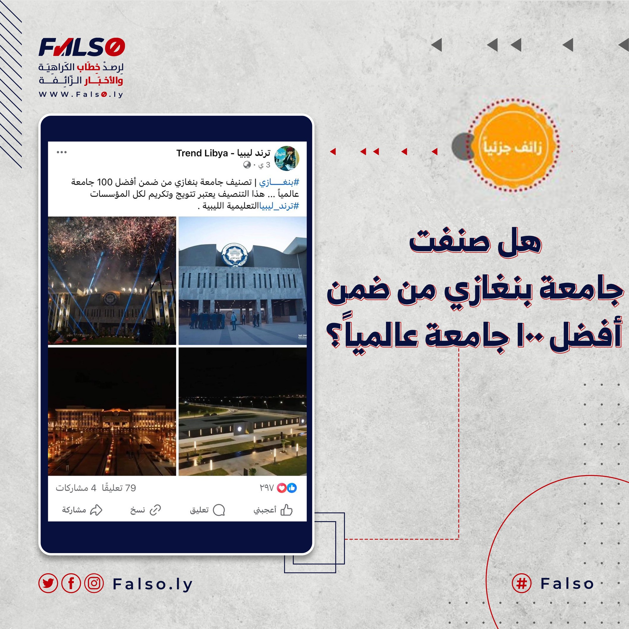 أنشرت صفحة ترند ليبيا – Trend Libya، ادعاء مفاده حصول “جامعة بنغازي”، على الترتيب 100 كأفضل جامعة عالمية، وأضاف أن هذا التصنيف يعتبر تتويجاً وتكريماً للمؤسسات التعليمية الليبية.
