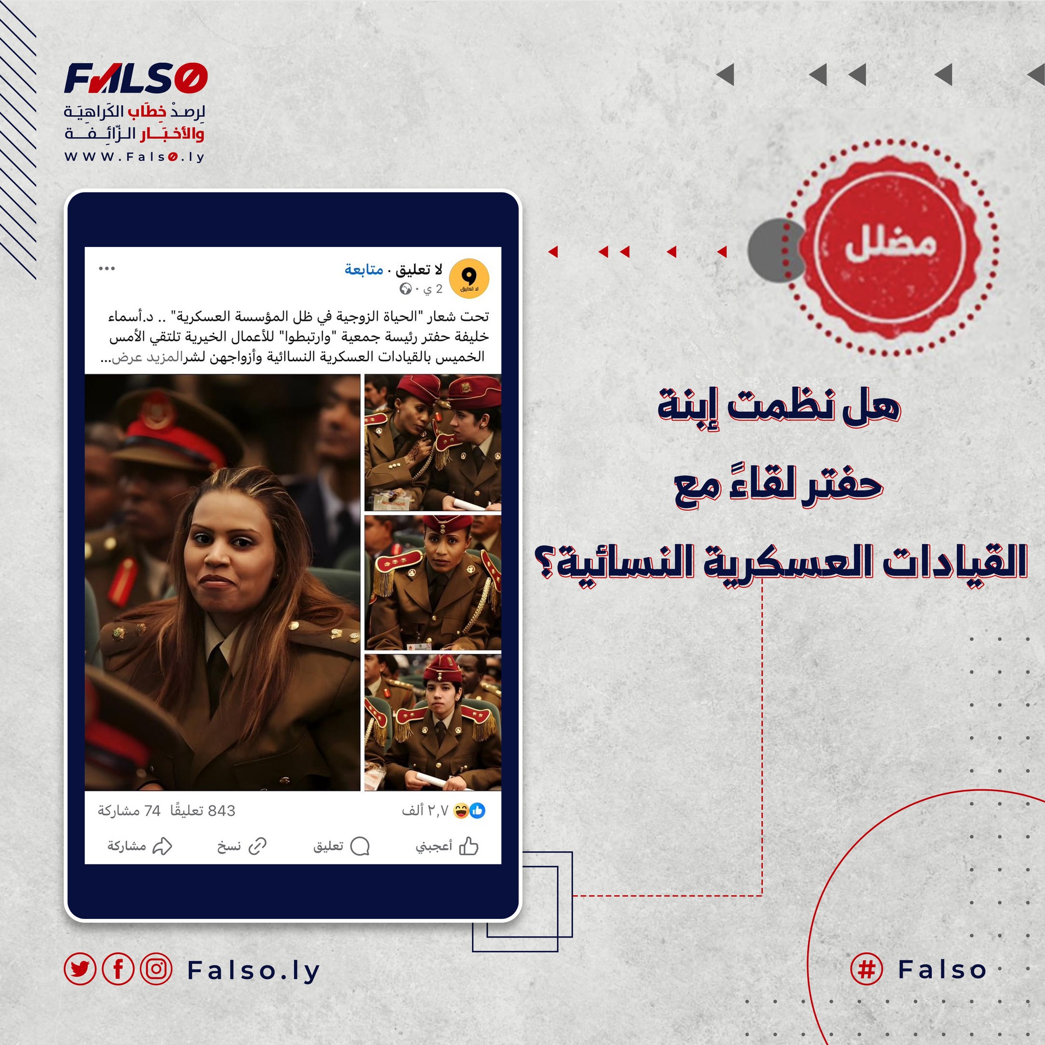 نقلت صفحات بموقع فيسبوك صوراً لعدد من النساء يرتدين الزي العسكري الليبي، وأرفقت بها ادعاءً حول لقاءً نظمته ابنة الجنرال خليفة حفتر أسماء برعاية جمعية (وارتبطوا) التي تترأسها، وحمل اللقاء شعار (الحياة الزوجية في ظل المؤسسة العسكرية)، مدعيين بأن هذا اللقاء جاء لشرح بعض التعاليم الضرورية ” للأسر العسكرية” حسب وصفهم