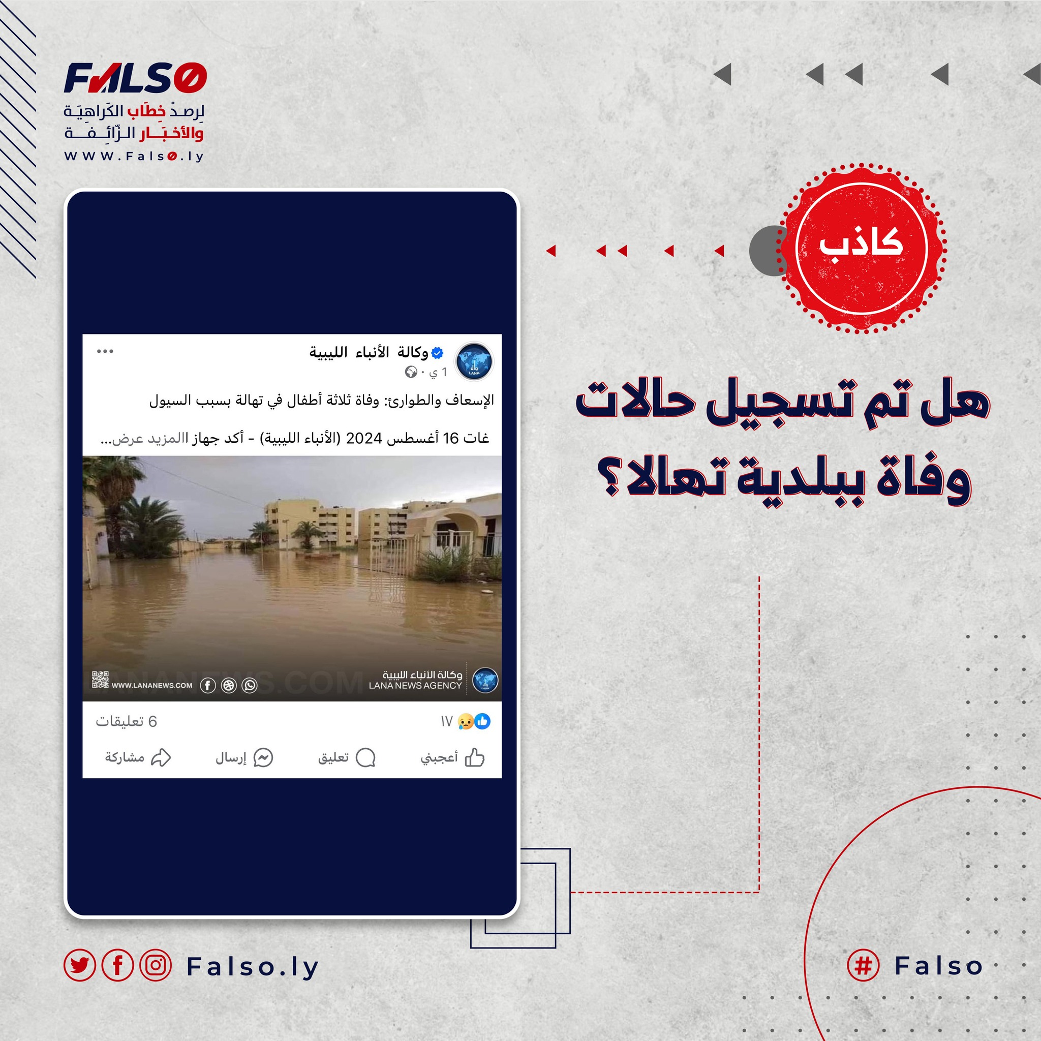 ادعت العديد من الصفحات الإخبارية الليبية والعربية بموقع فيسبوك؛ ادعاء كاذباً نقلاً عن الناطق الرسمي لجهاز الإسعاف والطوارئ أسامة علي مفاده وفاة ثلاثة أطفال ببلدية تهالا نتيجة السيول التي اجتاحت المنطقة.
