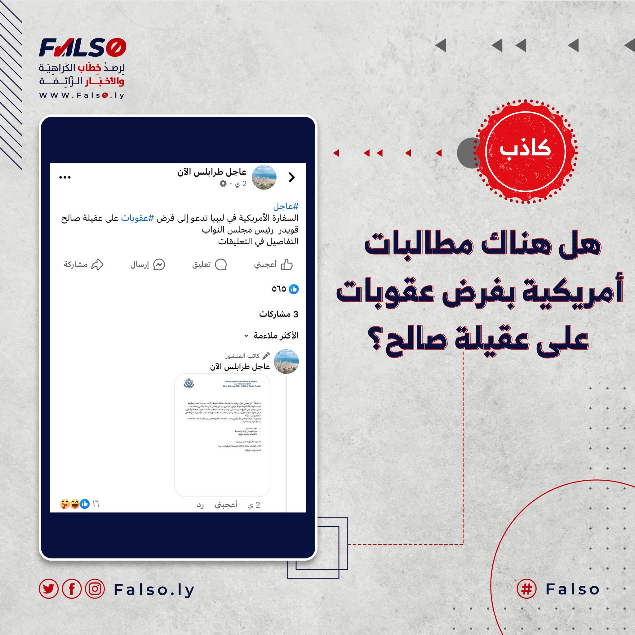 تحقق فريق فالصو من الرسالة، بالعودة إلى الصفحة الرسمية للسفارة الولايات المتحدة الأمريكية، على منصة إكس، تبين أن السفارة الأمريكية في ليبيا نفت الوثيقة المتداولة بشأن مطالبتها لمجلس الأمن فرض عقوبات على رئيس مجلس النواب عقيلة صالح، وأشارت إلى أن المراسلة قد أخذت من رسالة تعزية صادرة عن السفارة.