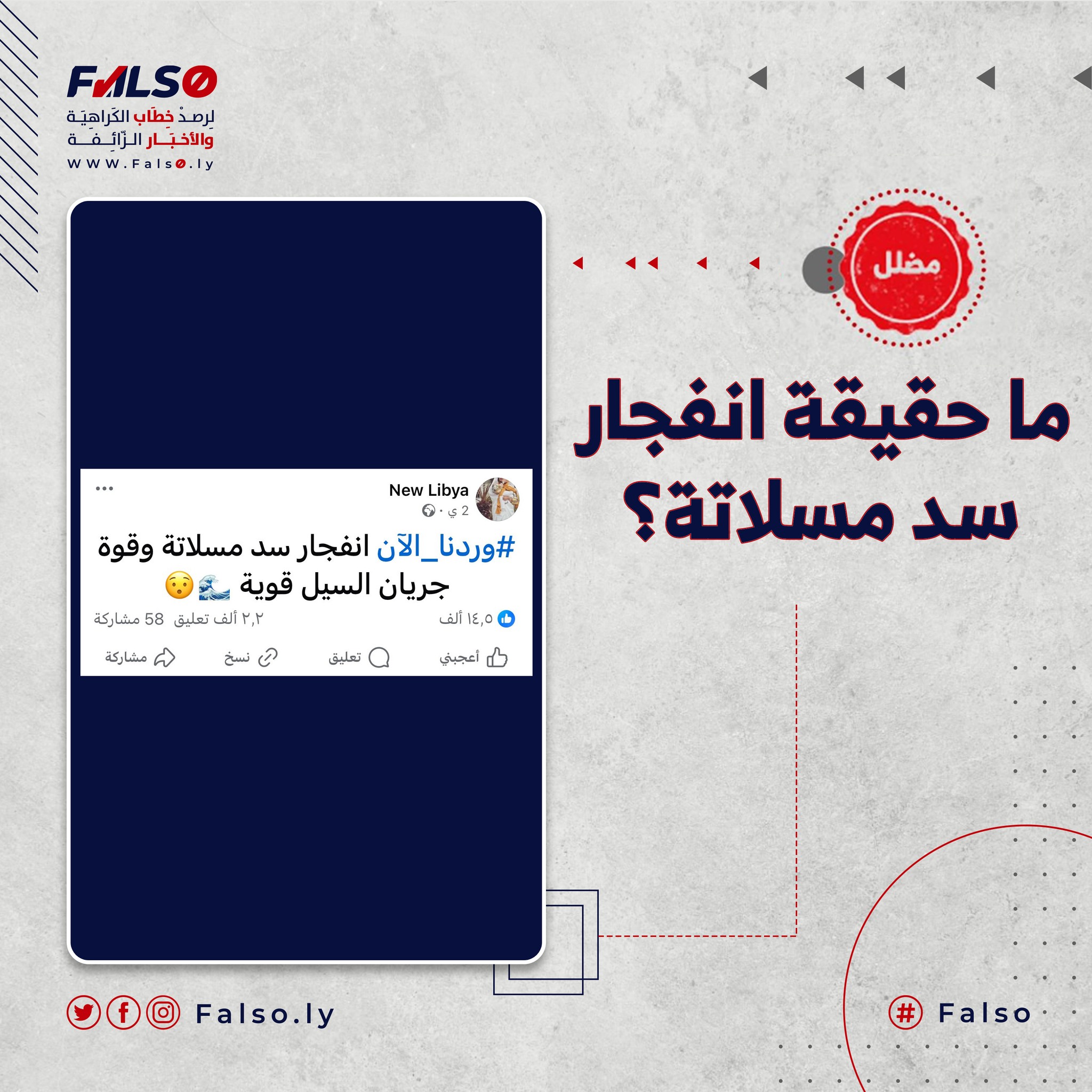 نشرت إحدى الصفحات بموقع فيسبوك، ادعاء كاذباً بتاريخ 30 أغسطس 2024، ادعاء مفاده انفجار سد مسلاتة وجريان السيل قوية، مرفق بفيديو في تعليقات، وقد حظي الادعاء بتفاعل كبير وصل إلى أكثر من 13.7 ألف متابع وعلق على الادعاء لأكثر من 2.1 ألف تعليق فيما تمت مشاركته 58 مرة.