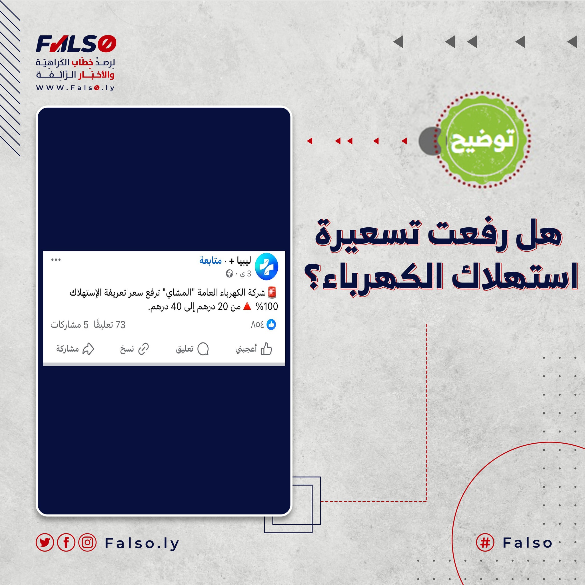 تناقلت صفحات التواصل الاجتماعي ادعاءً مفاده بأن الشركة العامة للكهرباء رفعت تسعيرة تعريفة الاستهلاك بنسبة 100% من عشرين درهماً إلى أربعين درهماً.