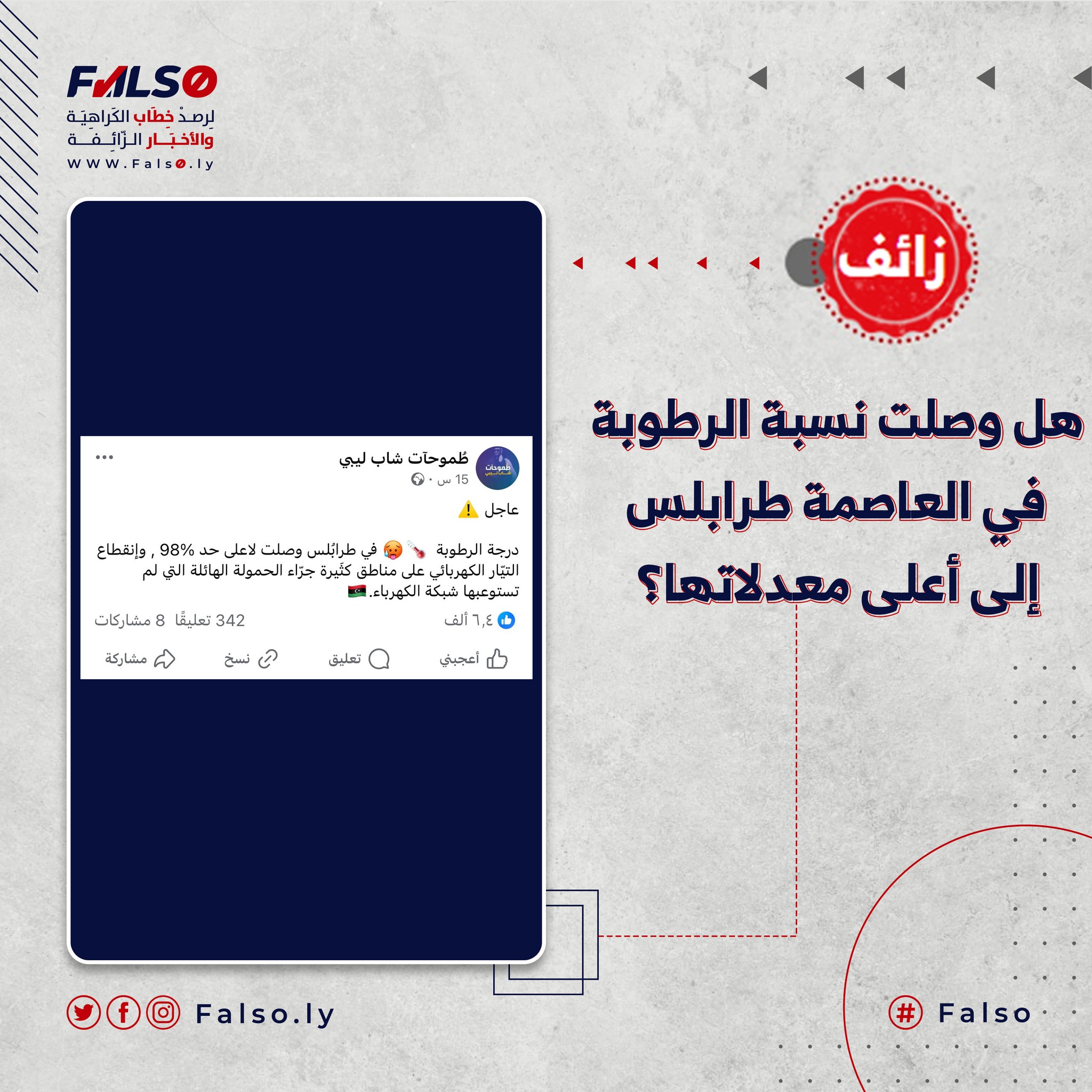ادّعت عدد من صفحات موقع التواصل الاجتماعي فيس بوك، ادعاء مفاده أن نسبة الرطوبة الجويّة بمدينة طرابلس قد وصلت لأعلى حد لها وهو 98%، تزامنا مع انقطاع التيار الكهربائي على مناطق كثيرة من العاصمة الليبية.