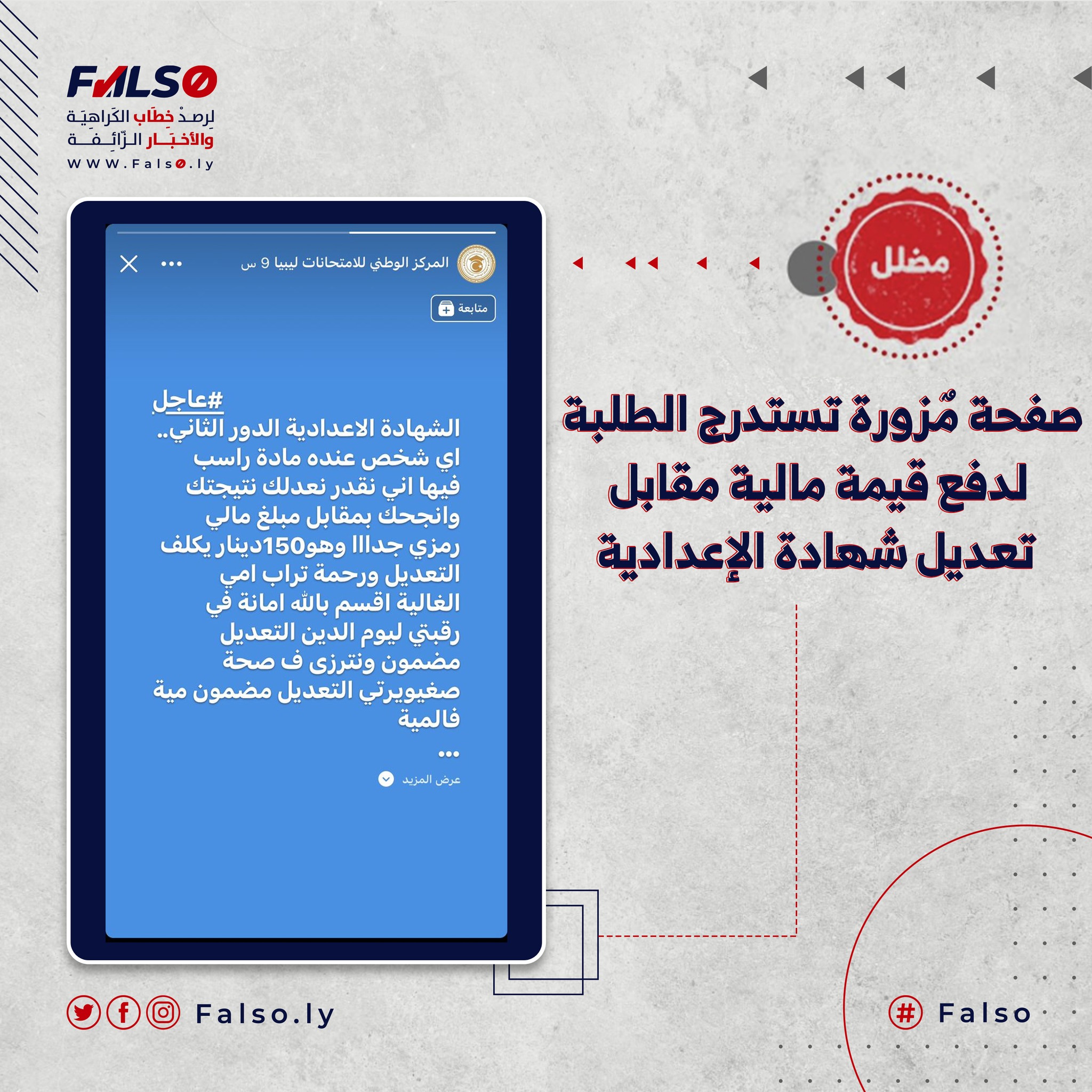 نشرت صفحة على موقع فيسبوك، تحمل اسم المركز الوطني للامتحانات ليبيا لديها و32 ألف متابع، وتٌقدم نفسها إنها تهتم بتسريب أسئلة الامتحانات للشهادتين الإعدادية والثانوية كما موضحة في السيرة الذاتية في الملف الشخصي للصفحة، منشورا عبر الصفحة يحفز طلبة الشهادة الإعدادية من لم يحالفهم الحظ بالنجاح في الدور الثاني بمادة دراسية واحدة بمراسلة الصفحة وتعديل نتيجة الامتحان بقيمة مئة وخمسين ديناراً فقط.