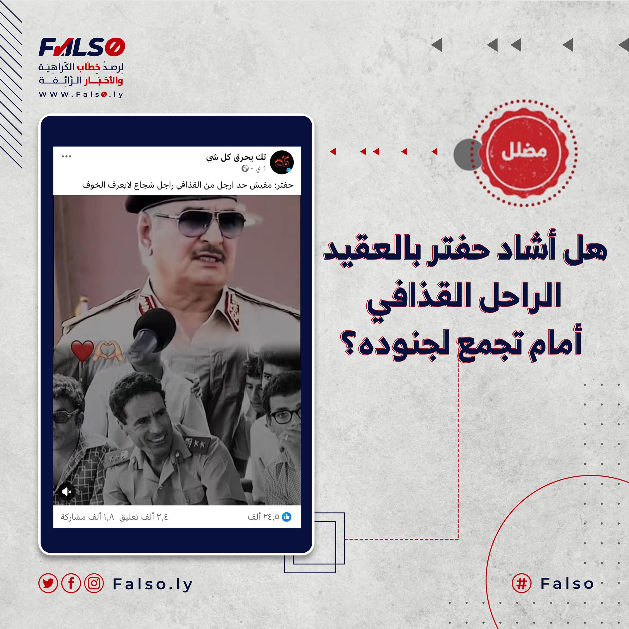 ادّعت احدى الصفحات بموقع فيسبوك، أن قائد القوات المُسلحة شرقي ليبيا الجنرال خليفة حفتر قد أشاد برجولة العقيد الراحل معمر القذافي، حسب الوصف الآتي: “ما فيش حد أرجل من القذافي، رجل شجاع لا يعرف الخوف” وذلك أثناء كلمة له أمام جمع عسكري لإحدى الكتائب التابعة لقوات المُسلحة.