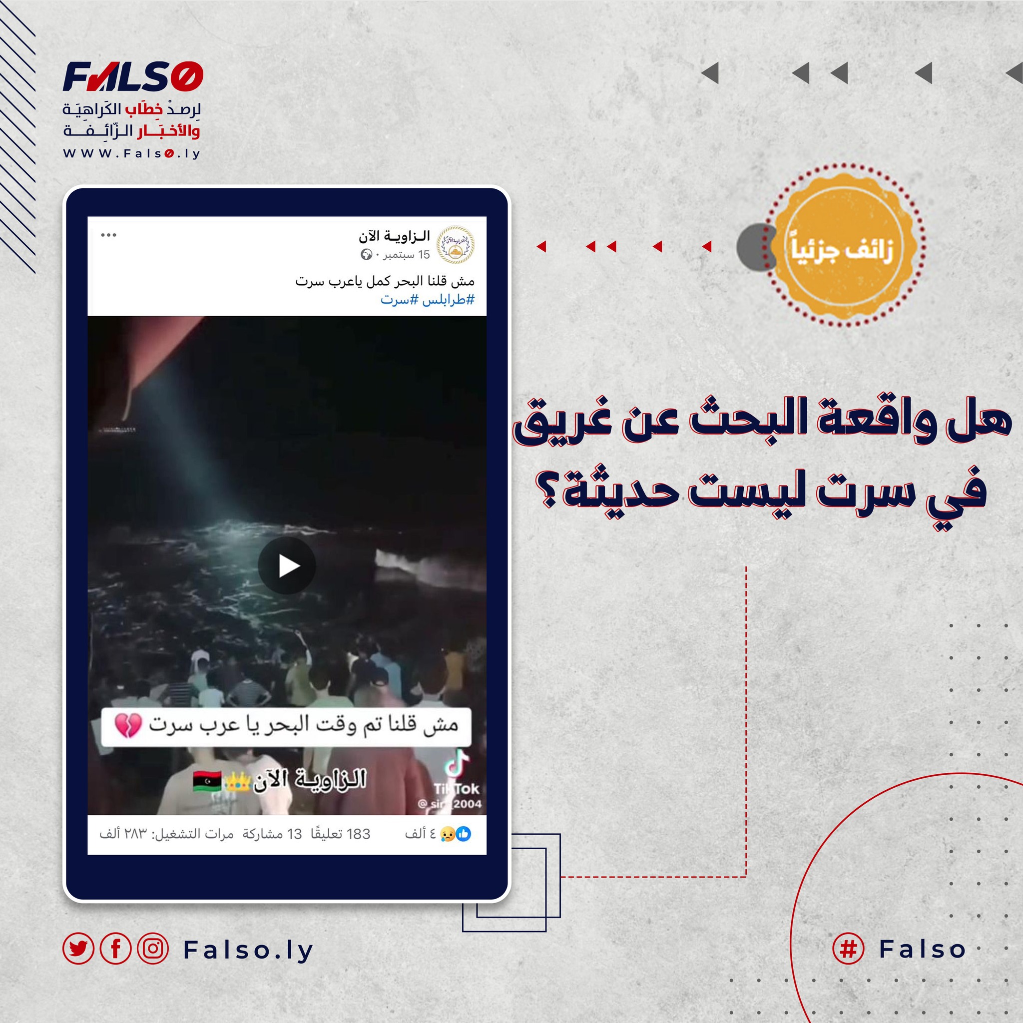 نشرت صفحة بموقع فيسبوك في منتصف شهر سبتمبر الجاري، ادعاءً مفاده غرق مواطن بسواحل خليج سرت وقيام عدد من الناس بعمليات البحث والإنقاذ في عتمة الليل، وقد عنونت الصفحة الادعاء المرفق بفيديو بالقول “مش قلنا وقت البحر تم يا عرب سرت”.