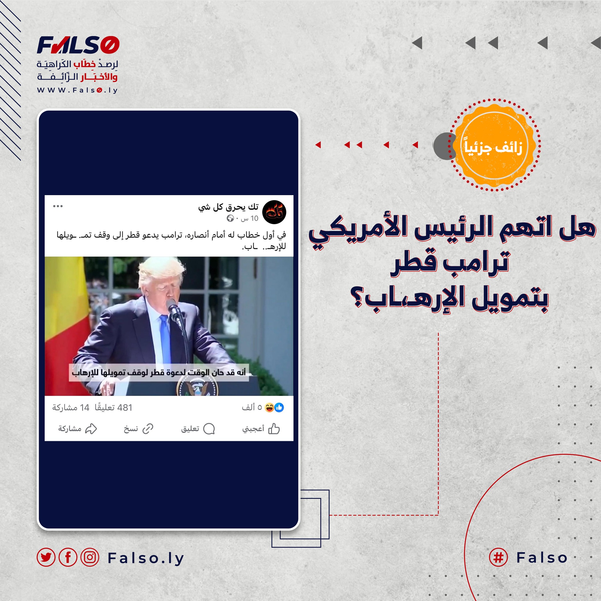 تداولت عدة صفحات بموقع فيسبوك، ادعاء زائفاً جزئياً مفاده دعوة المرشح الرئاسي الأمريكي ” دونالد ترامب” اليوم قطر إلى التوقف عن تمويل ” الإرهـــ•اب “، وفقاً لدعواتهم.