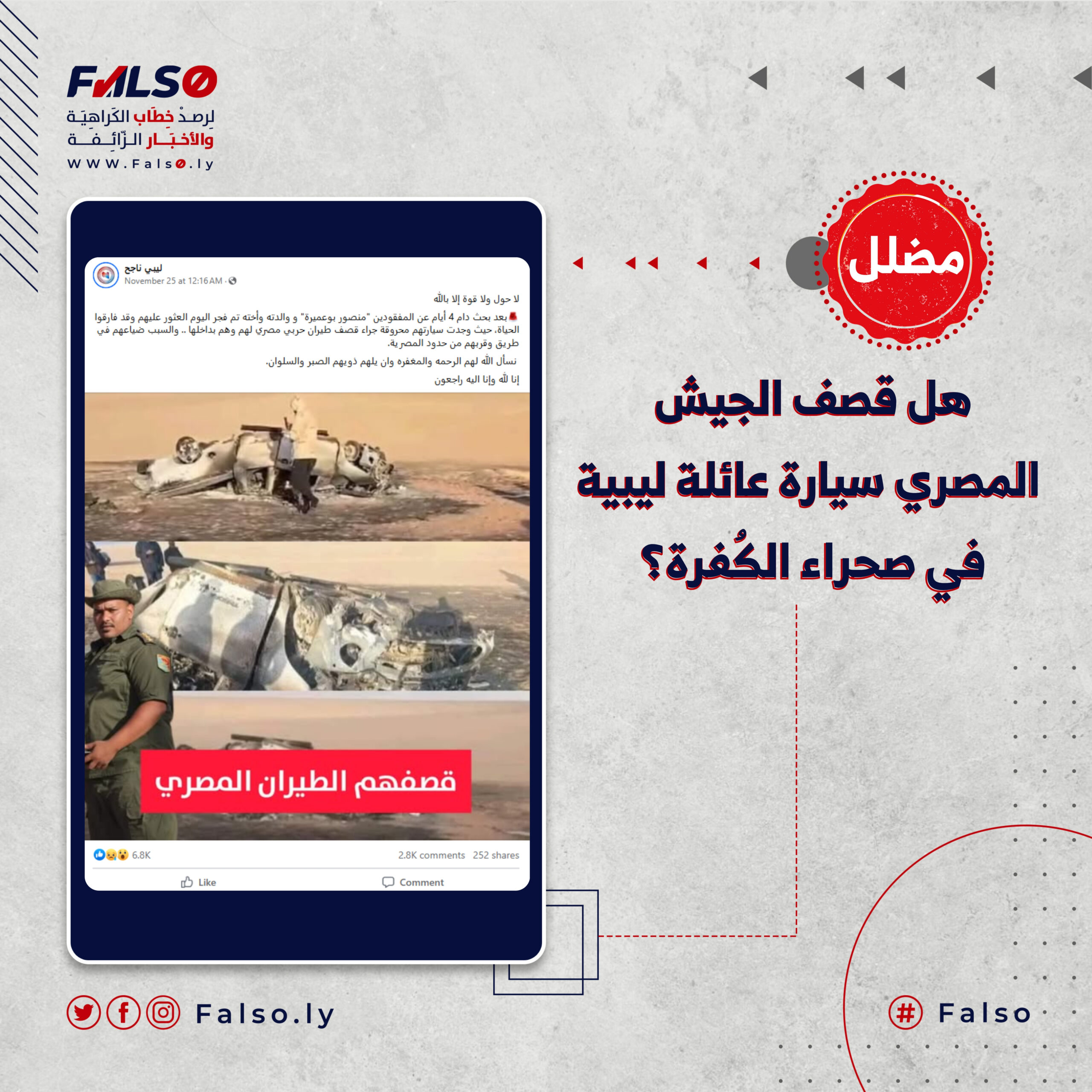 ادّعت عدة صفحات إخبارية بموقع فيسبوك، أن طيران الجيش المصري قصف سيارة مواطن ليبي يدعى “منصور أبوعميرة” رفقة عائلته في صحراء بلدة الكفرة في الجنوب الشرقي لدولة ليبيا،