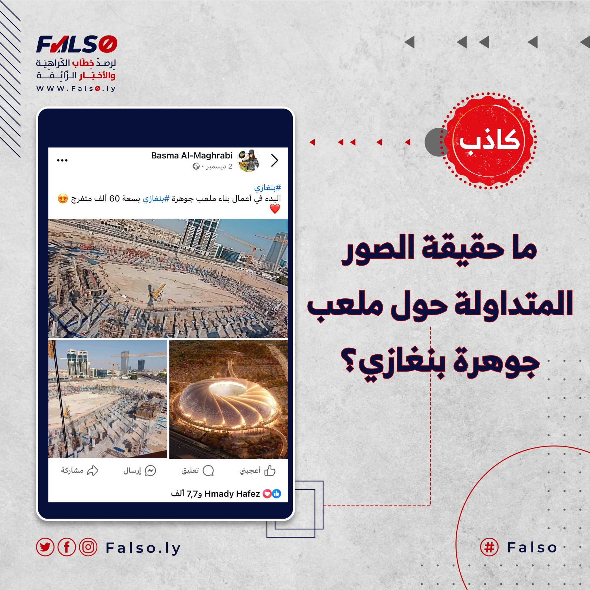 بناءً على ذلك فإن ادعاء البدء في بناء ملعب بسعة 60 ألف متفرج في مدينة بنغازي: كاذب