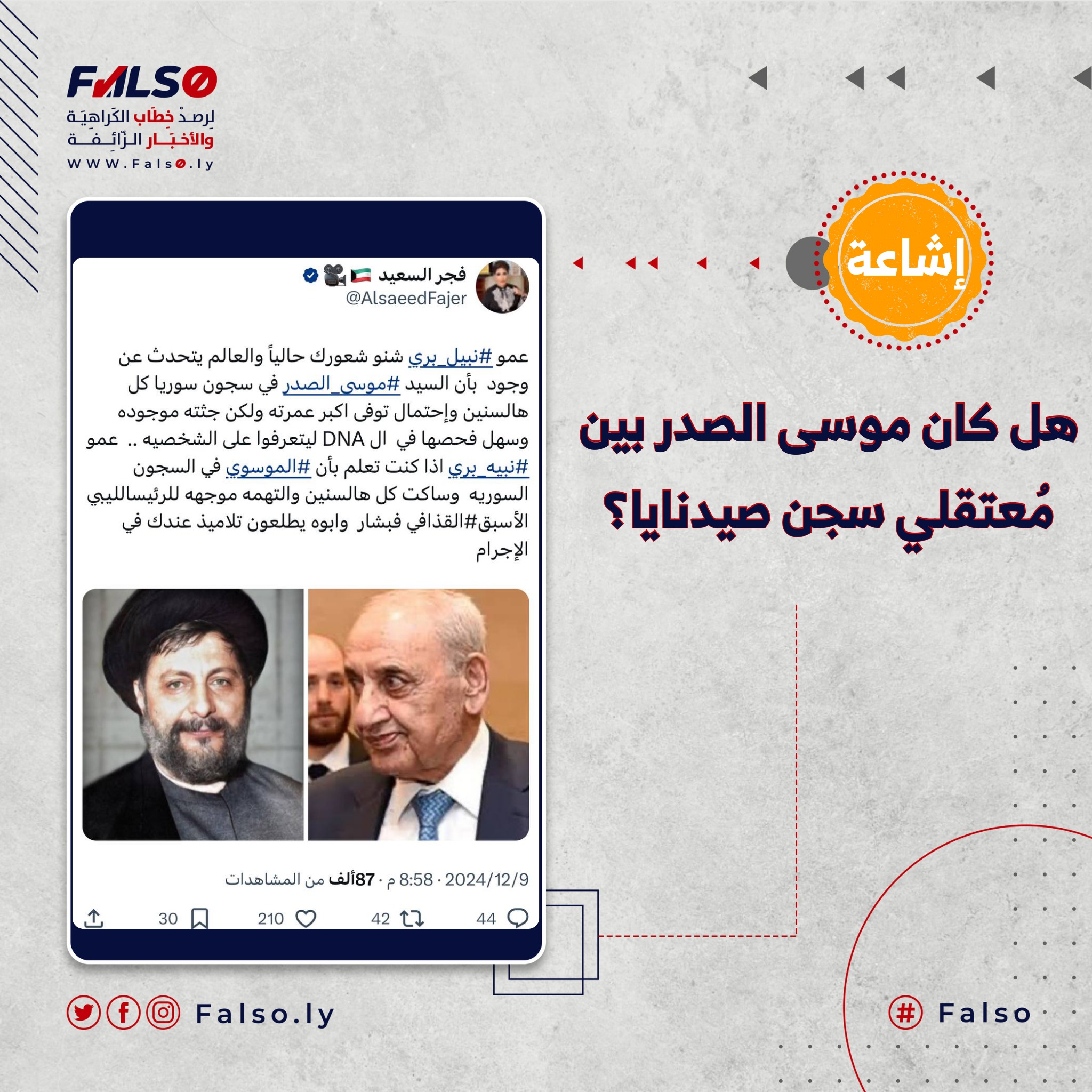 تداولت عدّة صفحات وحسابات عبر مواقع التواصل الاجتماعي المُختلفـة، ادّعاءً يُفيد بأن السجلات الموجودة في سجن «صيدنايا» في ريف دمشق، أظهرت وجود اسم الإمام الشيعي “موسى الصدر” في إحدى زنازينه، وقد حظي هذا الادعاء على انتشار واسع، وكان من بين الحسابات التي تداولته، الكاتبة والإعلامية الكويتية “فجر السعيد” عبر منصة إكس.