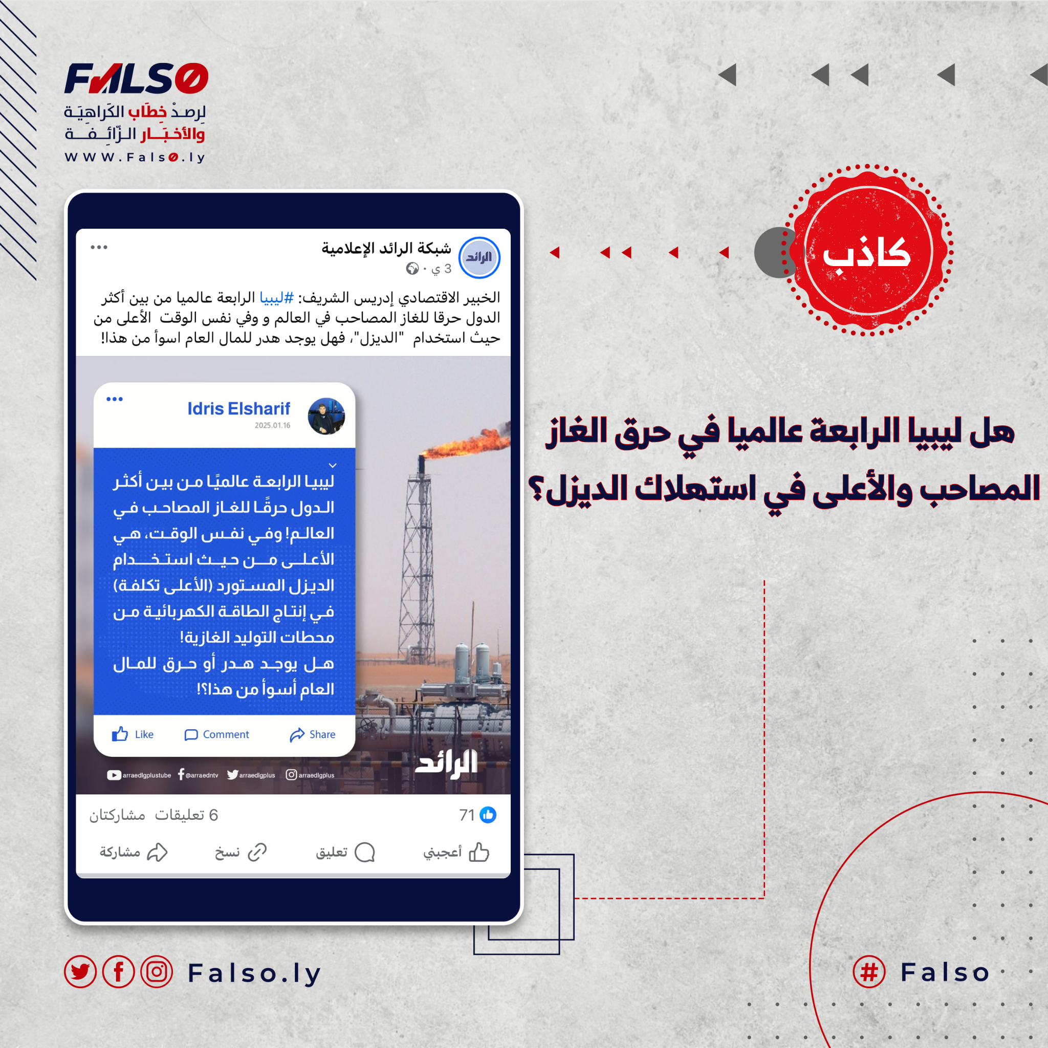 نشرت إحدى وسائل الإعلام عبر صفحتها على فيسبوك تصريحًا منسوبًا إلى خبير اقتصادي ليبي يشير إلى أن ليبيا تحتل المرتبة الرابعة عالميًا في حرق الغاز، وأنها الأعلى استهلاكًا للديزل، مستندًا بذلك إلى مقال مطول نُشر بتاريخ 9 يوليو 2024 عبر إحدى وسائل الإعلام، يدعي أن ليبيا تحتل المرتبة الرابعة عالميًا بين أكثر الدول حرقًا للغاز المصاحب.