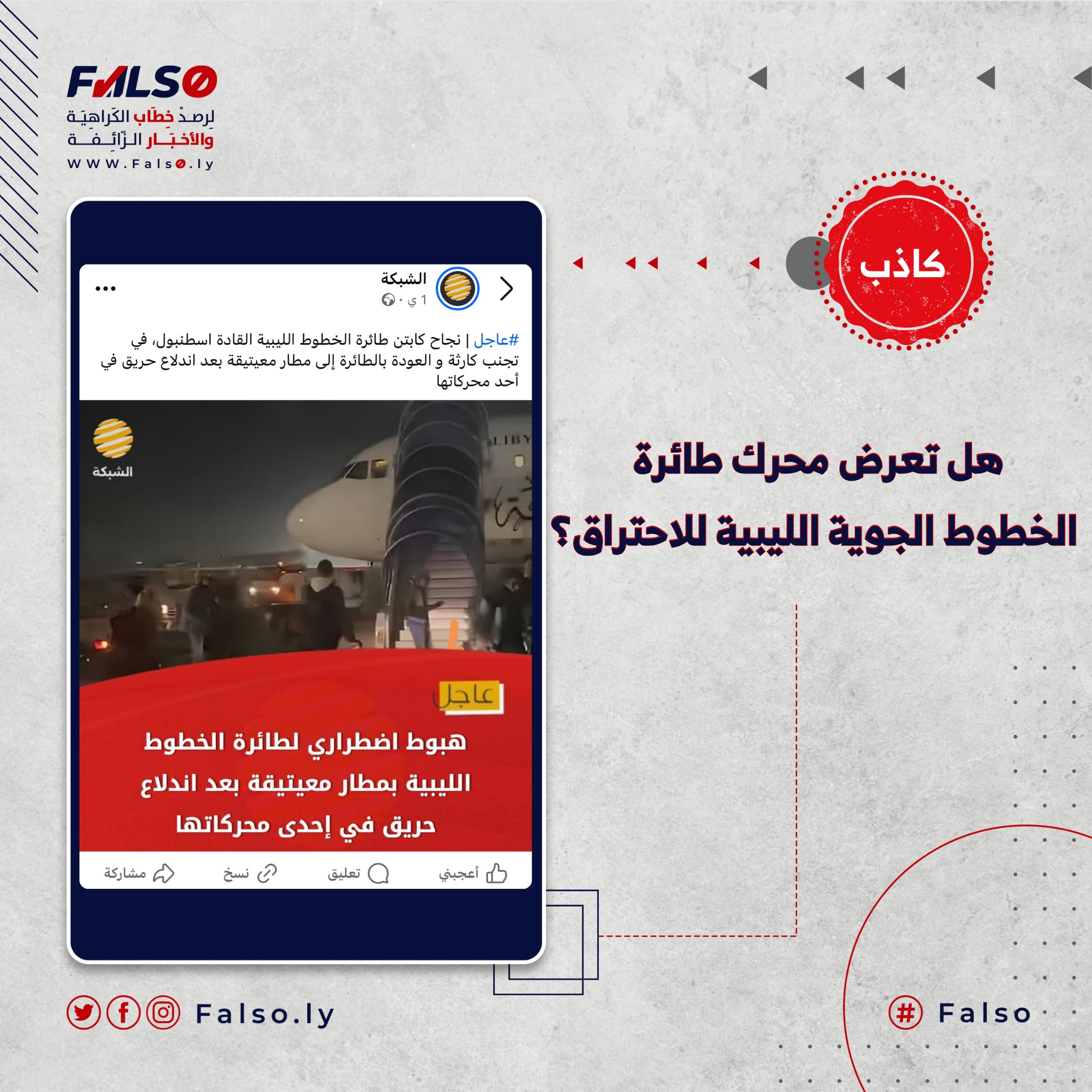 بالبحث عن صحة الادعاء، تبين أن الصفحة الرسمية لشركة الخطوط الجوية الليبية قد نشرت صباح اليوم التالي بيانًا توضيحيًا نفت فيه اندلاع حريق في محرك الطائرة المتجهة إلى مطار إسطنبول، مؤكدةً أن سبب عودة الطائرة إلى مطار معيتيقة يعود إلى تعرضها لخلل فني بسيط تم التعامل معه دون تسجيل أي إصابات أو أضرار، سواء بين الركاب أو طاقم الطائرة.