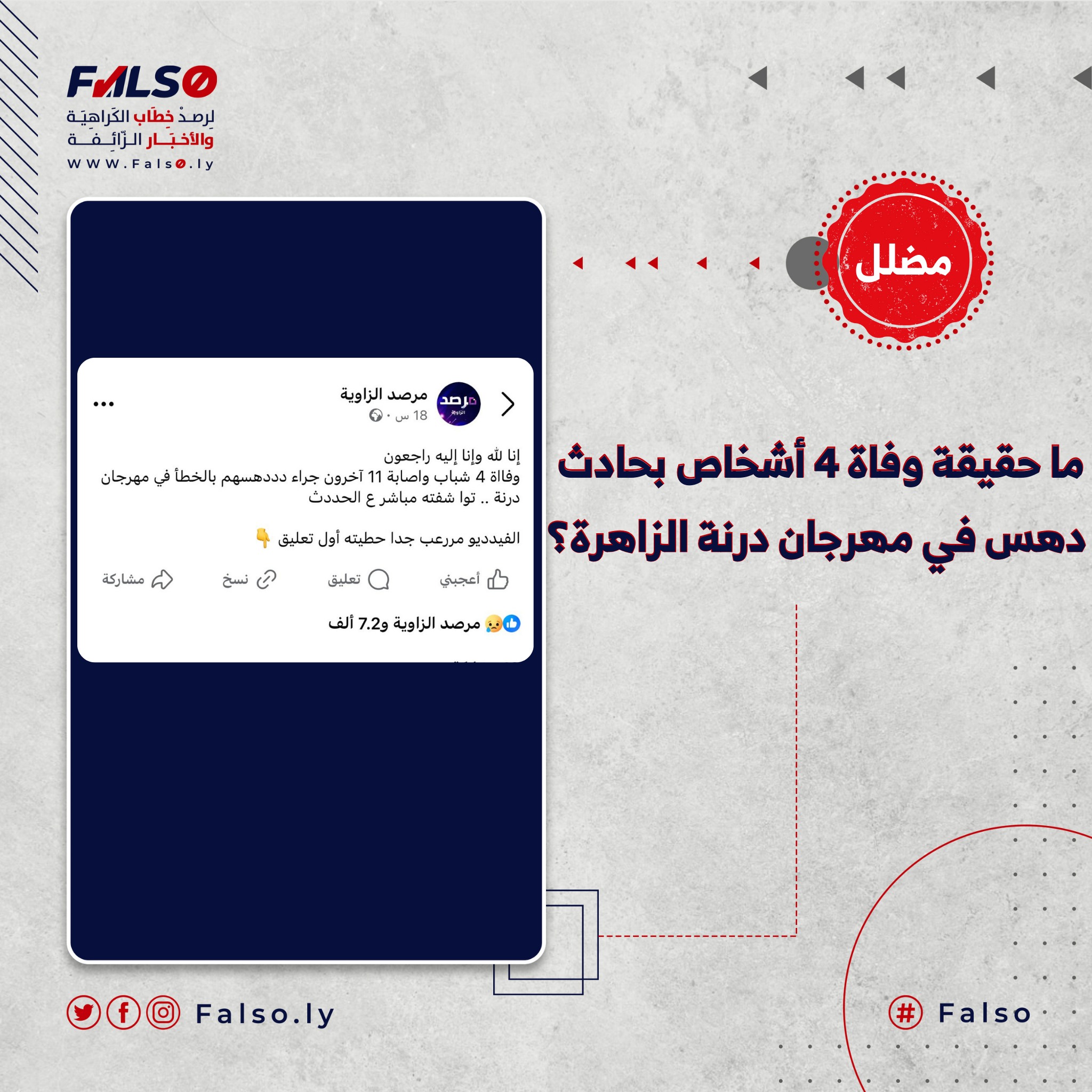 نشرت عدة صفحات ومجموعات بموقع فيسبوك، ادعاءً مفاده وفاة 4 شباب وإصابة 11 آخرون جراء حادثة دهس المتفرجين في فعاليات الدرفة على هامش مهرجان فعاليات درنة الزاهرة، مرفقين فيديو للحادثة اُجْتُزِئ من بث مباشر للمهرجان، نقلته إحدى القنوات الليبية.