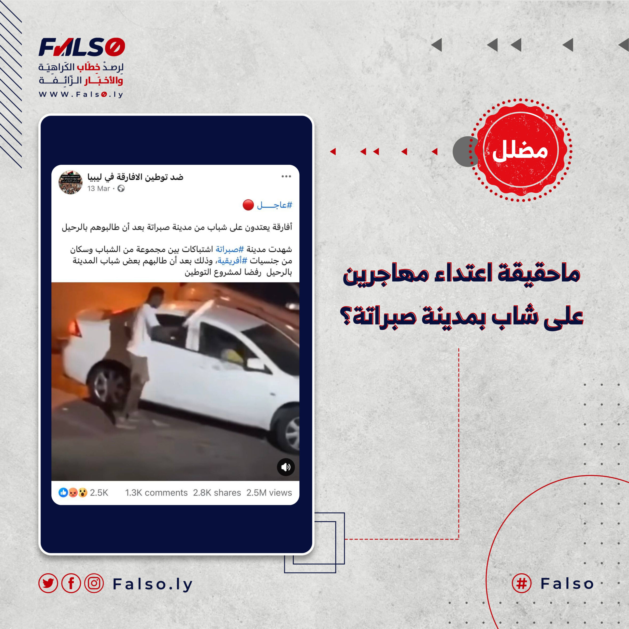 تداولت حسابات على مواقع التواصل الاجتماعي مقطعًا مرئيًا يظهر فيه اعتداء مجموعة من الأشخاص يحملون أسلحة بيضاء على سيارة أحد المواطنين، وزعم الادعاء أن الحادث مرتبط بمطالبة أهالي مدينة صبراتة للمهاجرين بالرحيل رفضًا لمشروع التوطين.