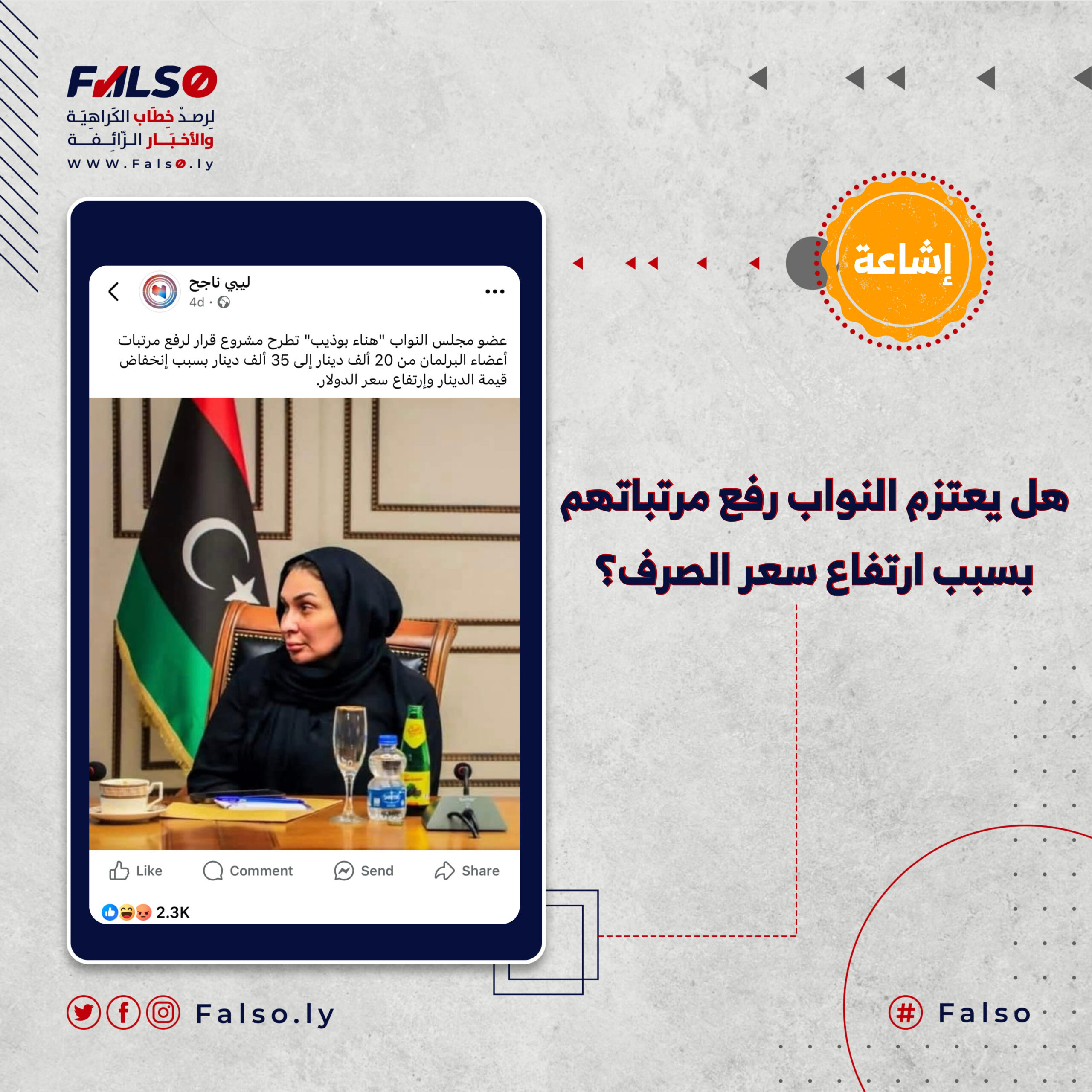 تداولت صفحات على موقع التواصل الاجتماعي فيسبوك ادعاءً يفيد بأن عضو مجلس النواب الليبي هناء بوذيب تقدمت بمشروع قرار لرفع مرتبات أعضاء مجلس النواب من عشرين ألف دينار إلى خمسة وثلاثين ألف دينار، معيدةً ذلك إلى انخفاض قيمة الدينار الليبي وارتفاع سعر صرف الدولار.