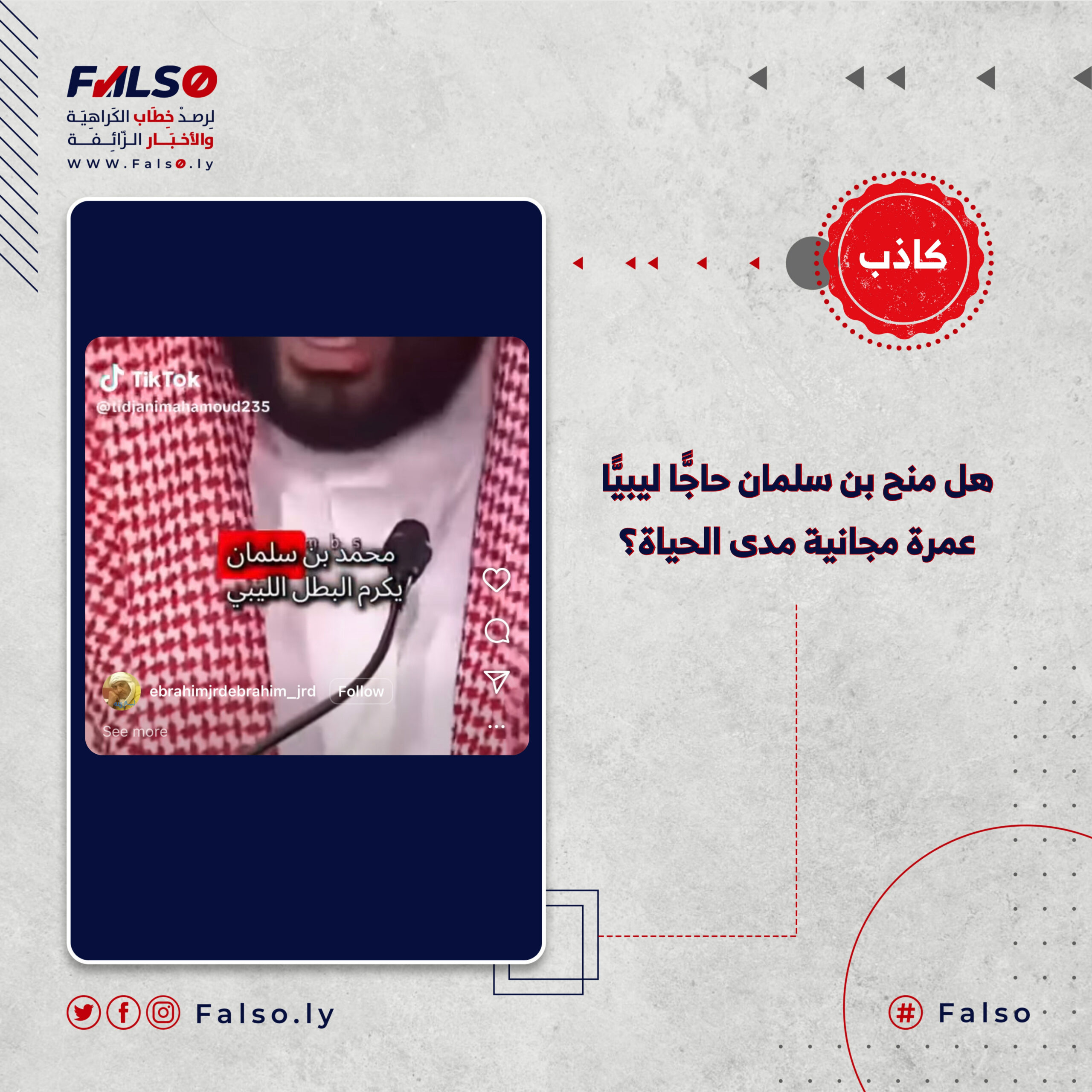 تداولت عدة حسابات بموقعي فيسبوك وتيك توك، ادعاء مفاده أن ولي العهد السعودي الأمير محمد بن سلمان قد منح حاجاً ليبي يدعى عامر القذافي عمرةِ مجانية مدى الحياة، وذلك بعد انتشار قصته في أثناء تعذره في البداية من الصعود على متن الطائرة لمشكلة في جواز السفر، قبل أن تتعطل الطائرة التي تنقل الحجيج ثلاث مرات من إقلاعها من مطار سبها جنوب ليبيا.