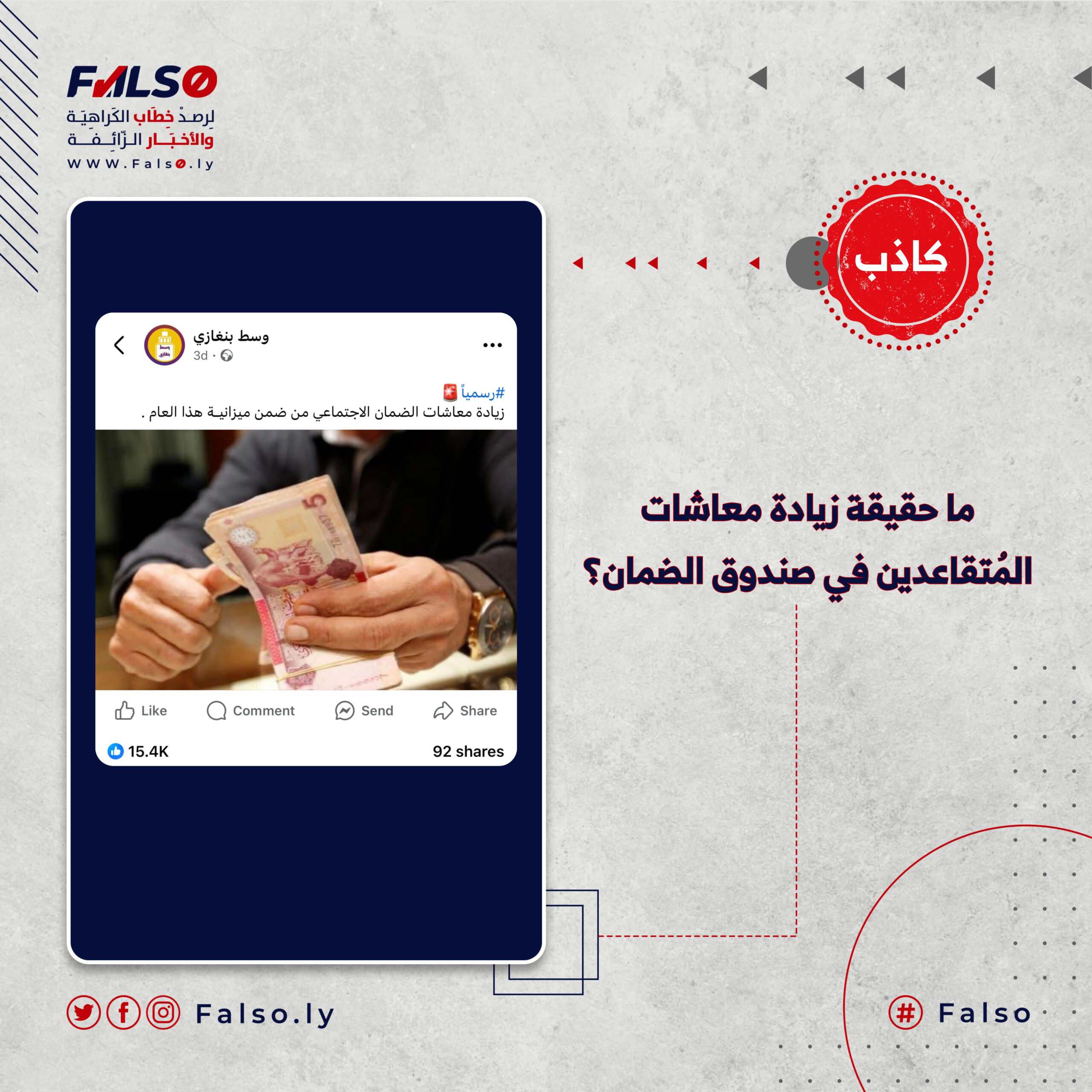 تداولت عدة صفحات بموقع فيسبوك، خبرًا ادعت فيه أن الميزانية العامة للدولة الليبية للعام الجاري 2025، قد تضمنت زيادة في مرتبات المٌتقاعدين المٌستفيدين من صندوق الضمان الاجتماعي على مستوى ليبيا.