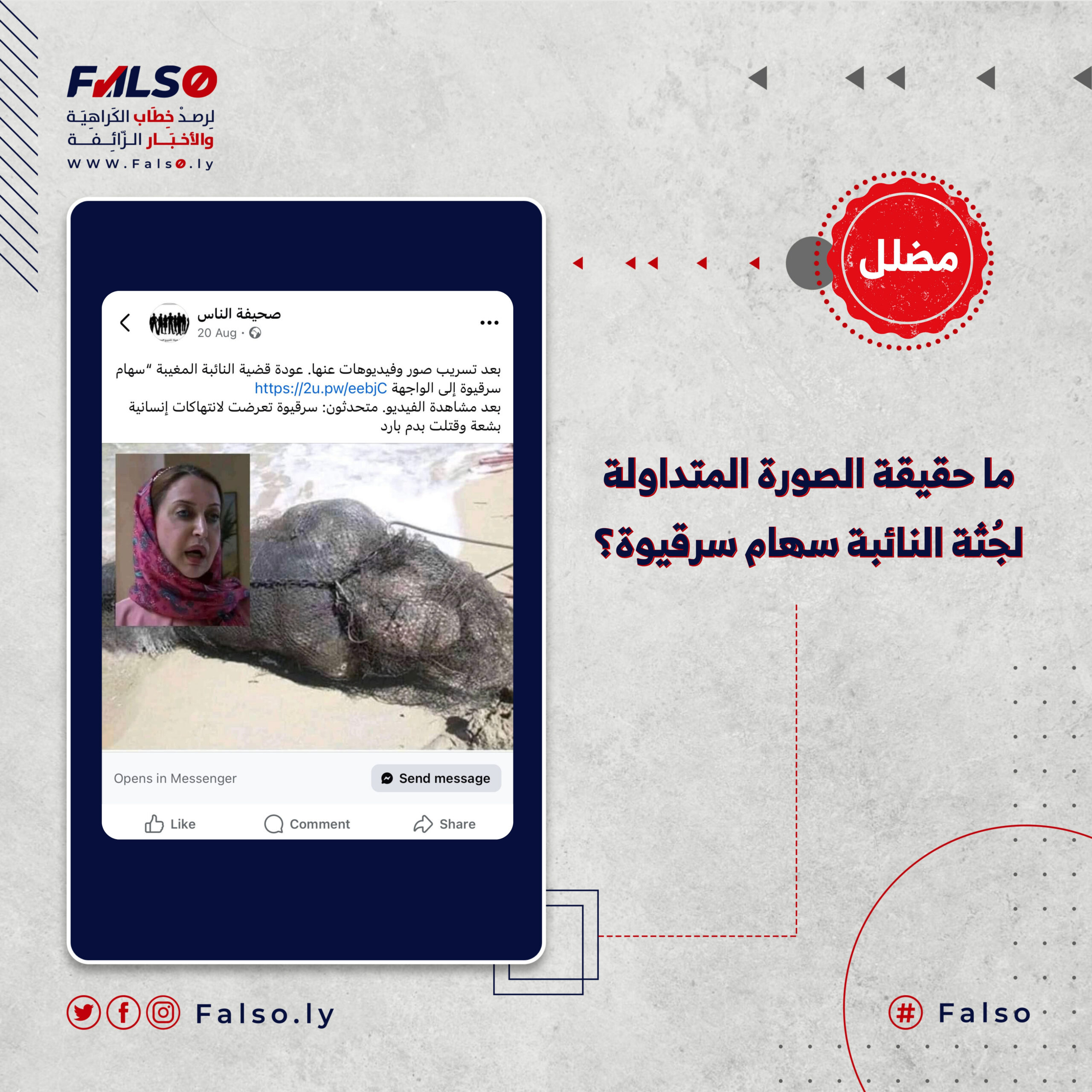 أظهر البحث العكسي للصورة المتداولة أنّها لا تعود لـ النائبة سرقيوة، فقد قادنا البحث إلى مقال نشرته منصة The Libyan Observer بتاريخ 2 أغسطس 2019، والذي أوضح أن الصورة تعود إلى جثة الناشط السياسي أحمد عمر الكوافي، التي قُتل ورُميت جثته وهي مقيدة بالسلاسل في البحر، وجرفتها الأمواج على شاطئ سيدي البراني في مدينة بنغازي.