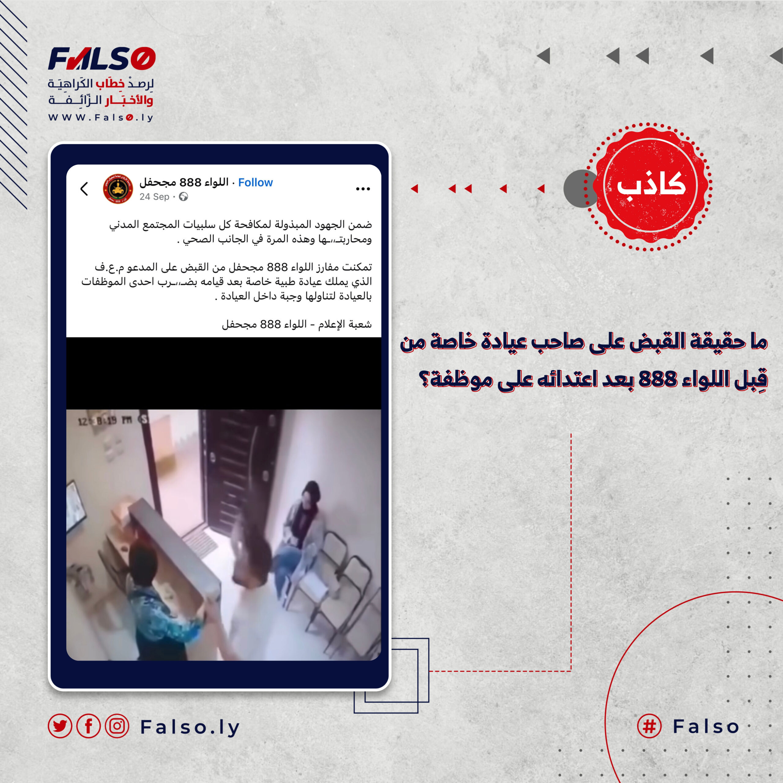 تداولت صفحات عبر موقع التواصل الاجتماعي فيسبوك مقطع فيديو يُظهر اعتداء أحد الأشخاص على امرأة، مع ادعاء أن اللواء 888 مجحفل ألقى القبض على صاحب عيادة خاصة بعدما اعتدى على موظفة بسبب تناولها وجبة داخل العيادة.