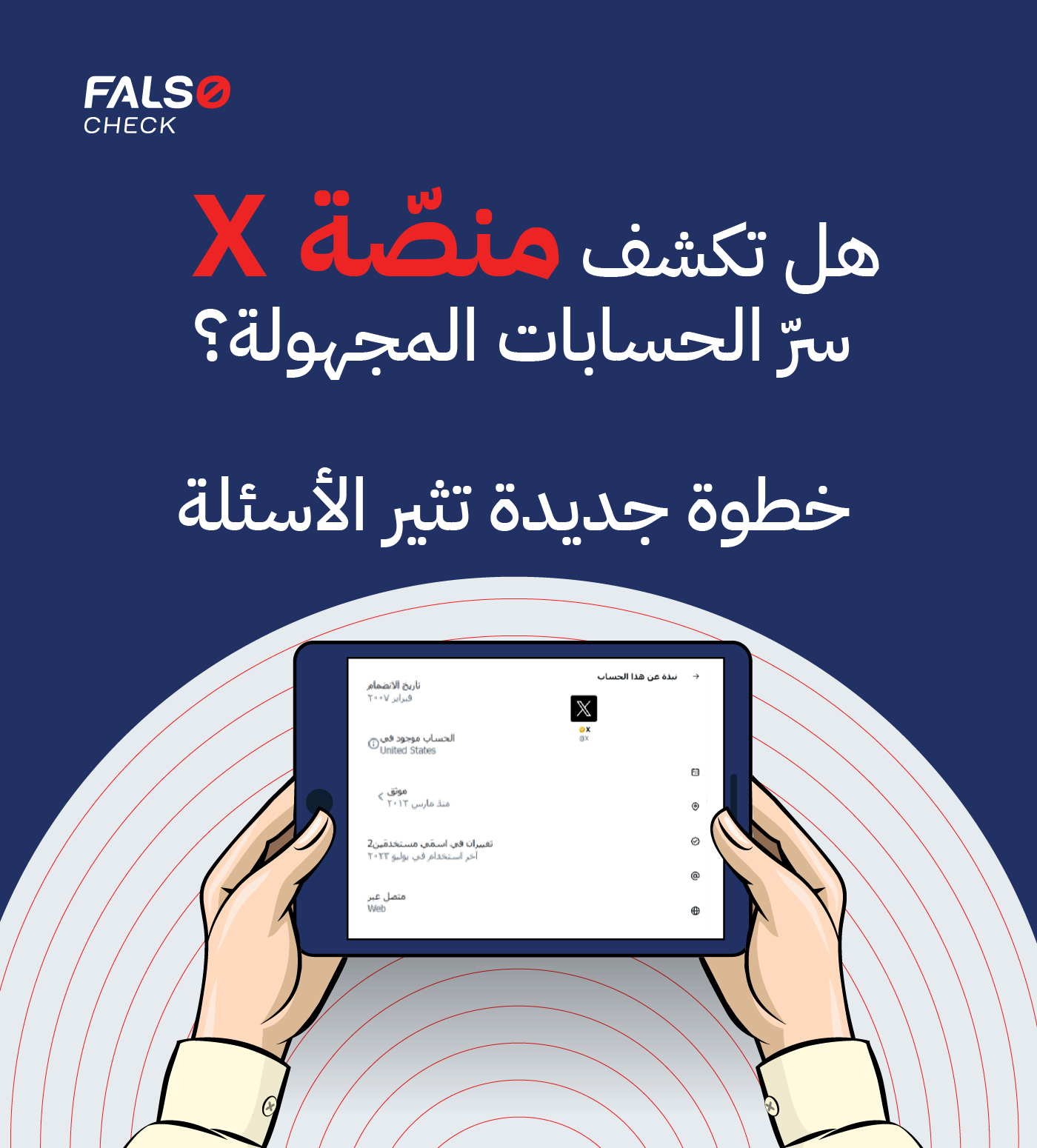 على غرار الإجراءات التي تتخذها منصّات كفيسبوك لتعزيز الشفافية، أعلنت منصّة إكس مؤخرًا عن تحديث أثار جدلًا واسعًا، بعدما قامت برفع مستوى إتاحة بيانات الحسابات من خلال عرض الموقع الجغرافي، وتاريخ الانضمام، وعدد مرّات تغيير الاسم. وبرّرت المنصّة هذا التغيير بأنه يهدف إلى تمكين المستخدمين من فهم خلفيات الحسابات المشاركة في النقاشات العامة، خاصة مع تصاعد نشاط الحسابات الوهمية والحملات المنسّقة العابرة للحدود.