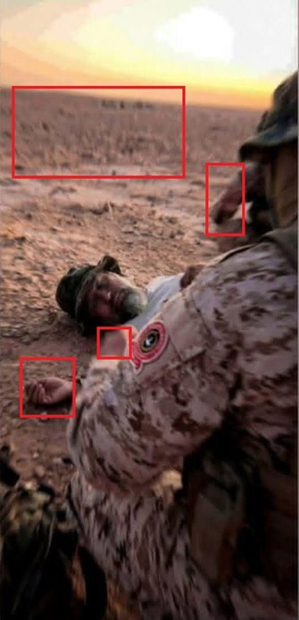 كشف تحليل الصورة الأولى عن تشويه في أطراف الجندي بجانب الجثمان، بالإضافة إلى ظهور أصابع يد القذافي اليمنى كاملة، وهو ما يناقض الواقع الموثق منذ سنوات، وتحديداً في ظهوره بمدينة سبها عام 2021، والذي يثبت بوضوح أن أصابع يده اليمنى مبتورة.
