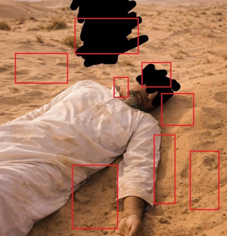 أما الصورة الثانية، فقد أكد موقع wasitai المتخصص في كشف المحتوى الرقمي أنها مولدة باستخدام الذكاء الاصطناعي، وهو ما يتوافق مع رصدنا لعيوب هيكلية وبيئية قاطعة؛ حيث بدت وضعية الجسم جامدة بشكل غير طبيعي وكأن الجثة موضوعة برفق فوق الرمال دون أي تداخل طبيعي مع الأرضية كما رصد التحليل تكراراً نمطياً في تموجات الكثبان الرملية وفشلاً في توزيع الظلال التي لا تتناسب مع حدة الشمس الظاهرة ومن الناحية الظرفية، ظهر القذافي في الصورة المزعومة بملابس صيفية خفيفة ونظيفة تماماً من الدماء، وهو ما لا يتماشى مع المناخ الشتوي لمدينة الزنتان في فبراير أو مع طبيعة حادثة اغتيال علاوة على ذلك، لوحظ وجود خربشة وطمس متعمد في وسط الشاشة وعلى منطقة الوجه، وهو ما يشير بوضوح إلى محاولة إخفاء العلامة المائية للمولد المستخدم وتغطية العيوب التشريحية التي فشل الذكاء الاصطناعي في ضبطها.