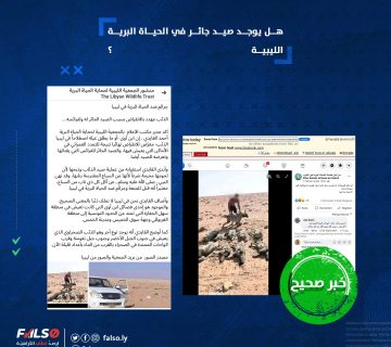 هل يوجد صيد جائر في الحياة البرية الليبية ؟M.alnajem22 فبراير، 2022الادعاء صحيح والصورة المرفقة مع الادعاء تم نشرها في صفحة الجمعية الليبية لحماية الحياة البرية عبر موقع التواصل الاجتماعي فيس ... المزيد