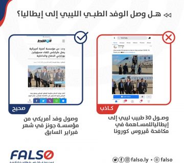 هل وصل الوفد الطبي الليبي إلى إيطاليا؟M.alnajem8 أبريل، 2020قامت صفحة إيطالية في الفيسبوك تسمى Visit Italy بتاريخ اليوم 08.04.2020 بنشر صور كاذبة مرفقة بنص يقول : ” ليبيا ... المزيد