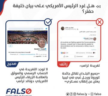 هل غرد الرئيس الامريكي علي بيان خليفة حفتر ؟M.alnajem28 أبريل، 2020تناولت العديد من صفحات التواصل الاجتماعي تغريدة مزيفة لدونالد ترامب رئيس الولايات المتحدة الأمريكية معلقاً فيها على خطاب القائد العام ... المزيد