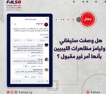 هل وصفت ستيفاني وليامز مظاهرات الليبيين بأنها أمر غير مقبول ؟M.alnajem3 يوليو، 2022 نشرت صفحة باسم “ليبيا مباشر” وهي صفحة تم إنشاؤها 4 مايو 2019 ويتابعها أكثر من 286 ألف متابع بتاريخ ... المزيد