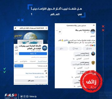 هل صُنفت ليبيا أكثر الدول التزاما دينياً في العالم ؟M.alnajem14 مارس، 2022 نشرت صفحة عامة بموقع فيسبوك تٌسمي ” نبض برقة ” ادعاء زائف مفاده إن “هيئات الإفتاء العالمية ” صنفت ليبية ... المزيد