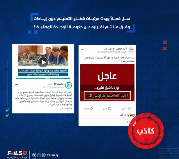 هل وردت مرتبات قطاع التعليم بدون زيادات وفق ما تم إقراره من حكومة الوحدة الوطنية ؟M.alnajem21 نوفمبر، 2021 ضنشرت صفحة اجدابيا الحرة بتاريخ السبت 20/11/2021 الادعاء التالي ” للأسف الشديد ورود مرتبات قطاع التعليم عن شهر 10 ... المزيد